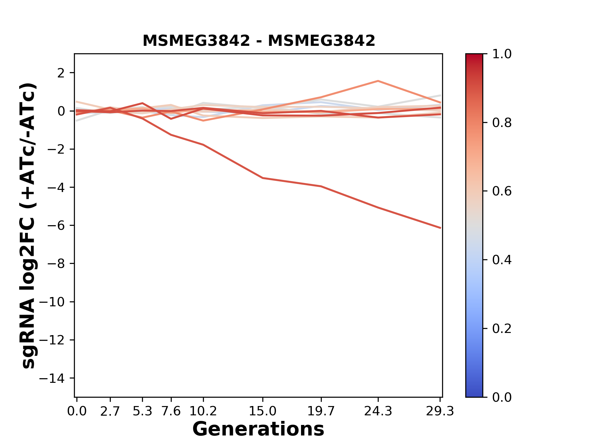 Here, we show sgRNA log2 fold-change values (L2FC) (plus versus minus ATc) over consecutive generations for sgRNAs targeting the gene you selected.