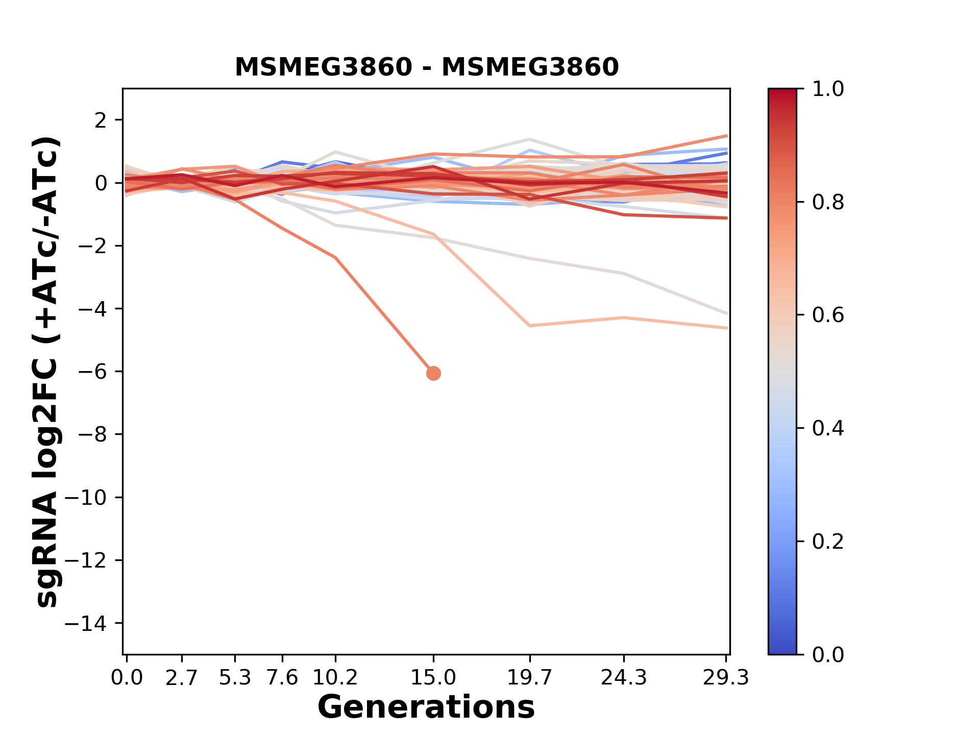 Here, we show sgRNA log2 fold-change values (L2FC) (plus versus minus ATc) over consecutive generations for sgRNAs targeting the gene you selected.
