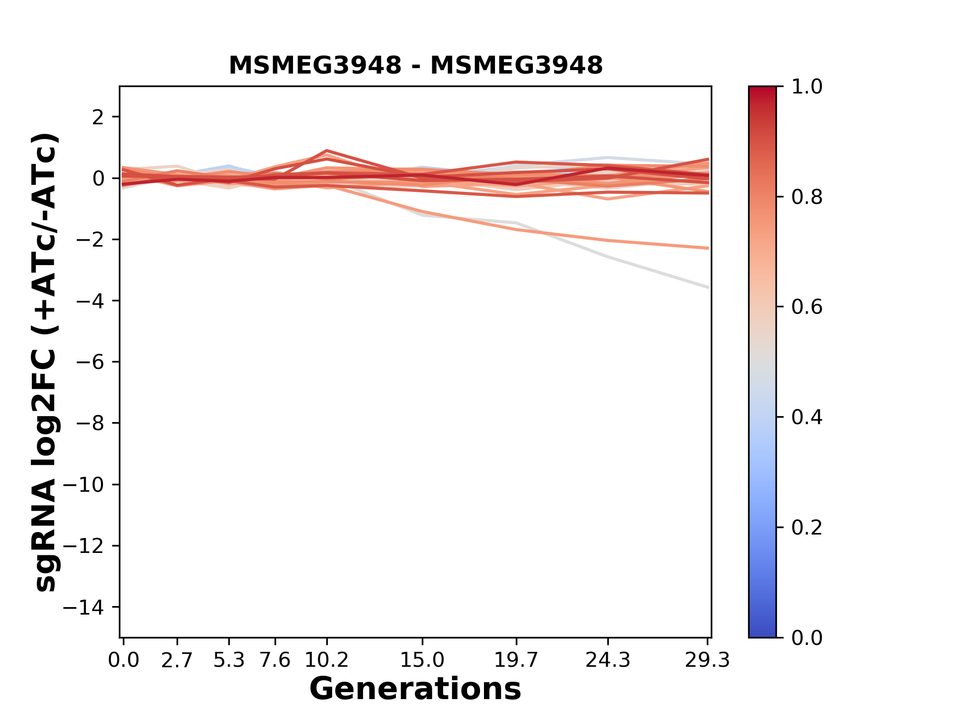 Here, we show sgRNA log2 fold-change values (L2FC) (plus versus minus ATc) over consecutive generations for sgRNAs targeting the gene you selected.