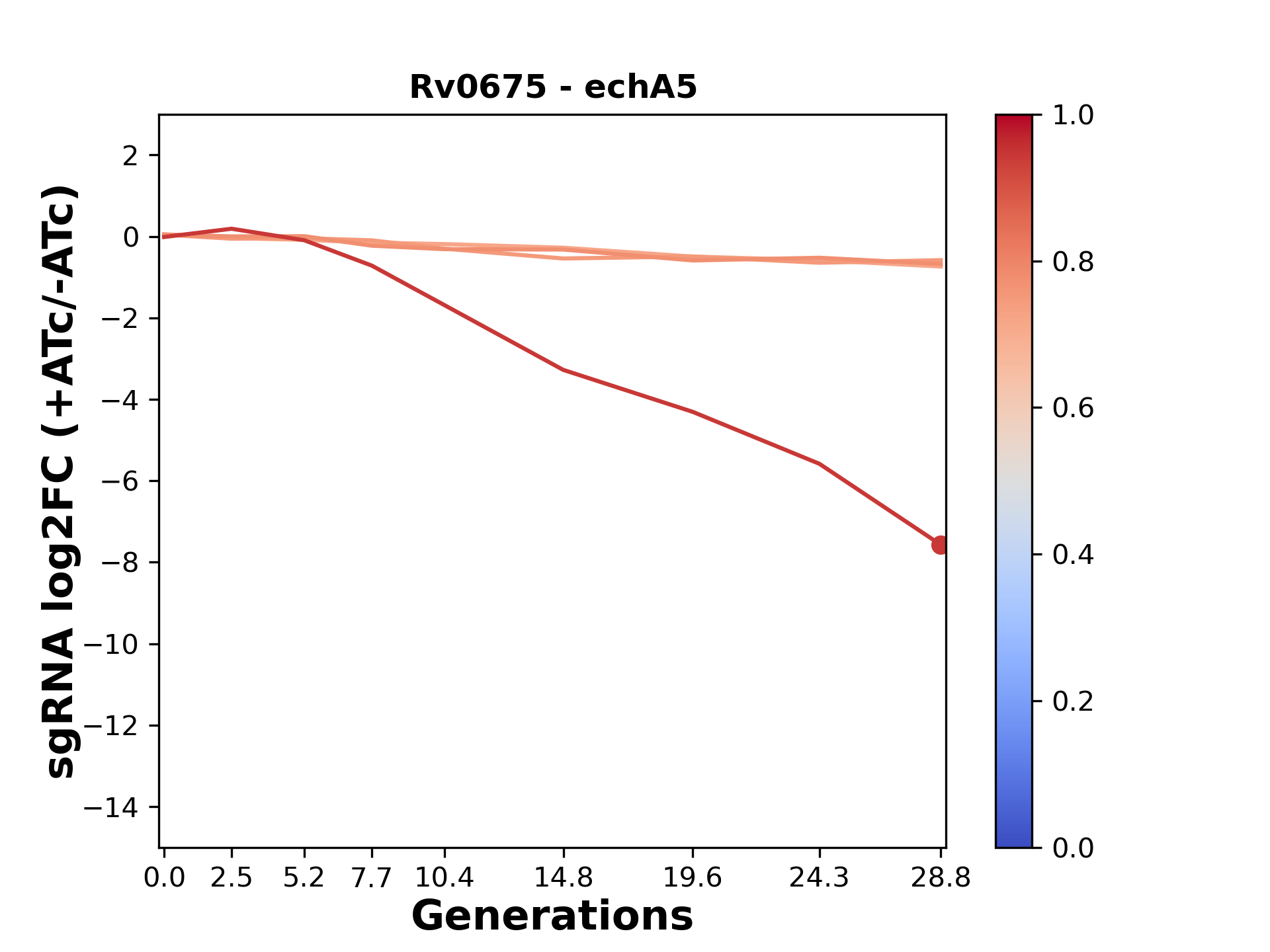 Here, we show sgRNA log2 fold-change values (L2FC) (plus versus minus ATc) over consecutive generations for sgRNAs targeting the gene you selected.