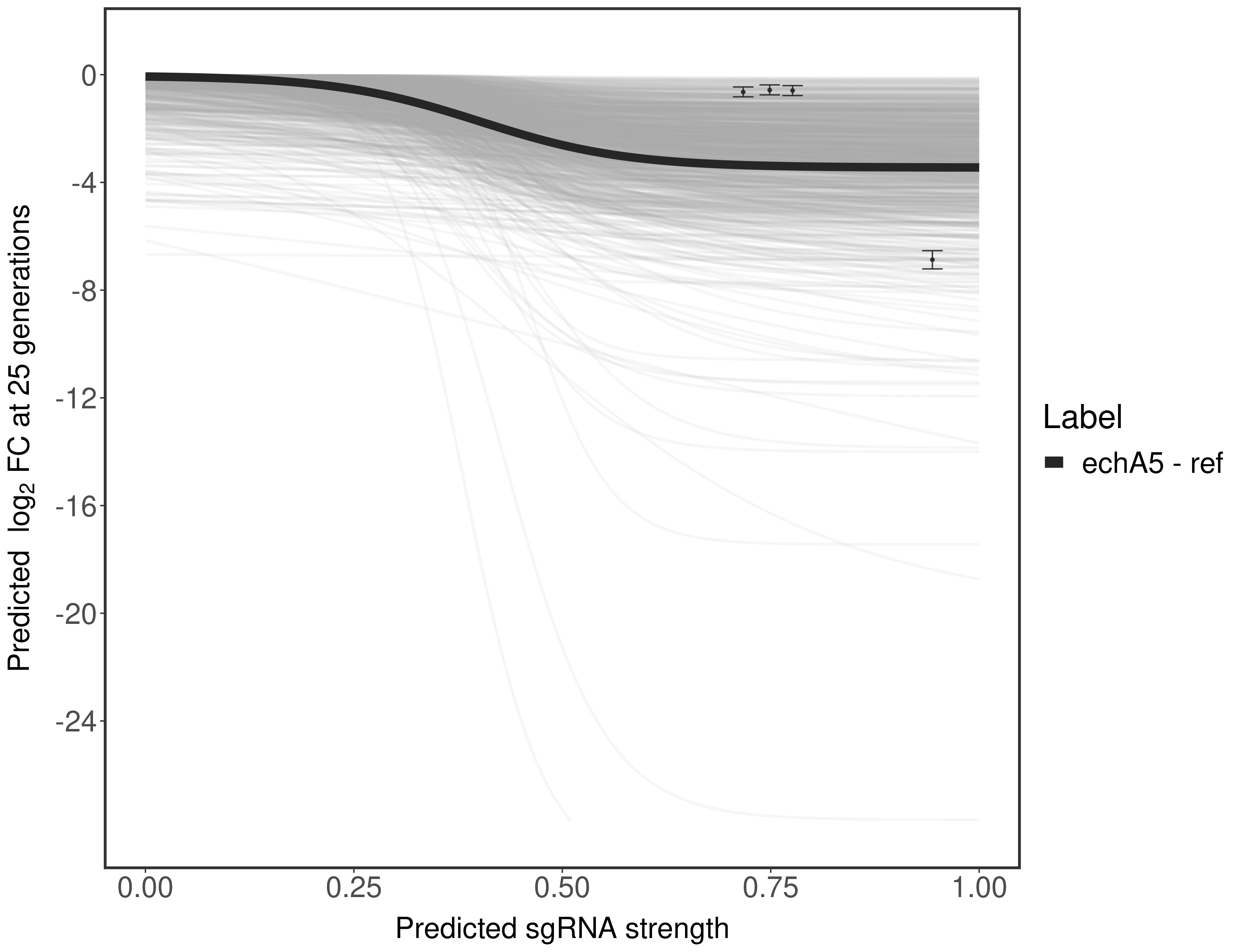 In order to quantify gene vulnerability, data were subsequently analyzed with a hierarchical model at the sgRNA level (two-line model) and gene level (Hill curve). The vulnerability quantification is shown below. [More information]