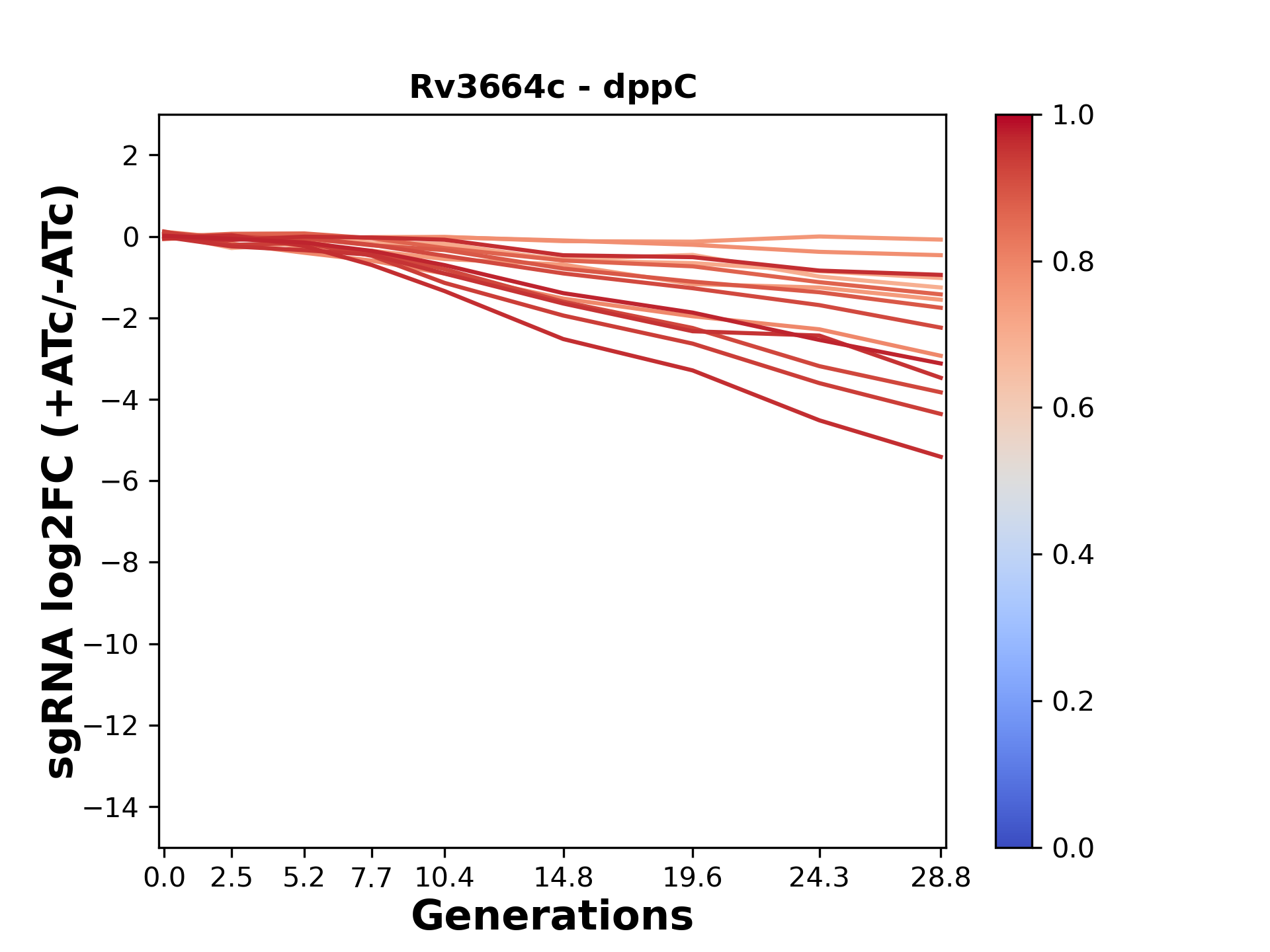 Here, we show sgRNA log2 fold-change values (L2FC) (plus versus minus ATc) over consecutive generations for sgRNAs targeting the gene you selected.