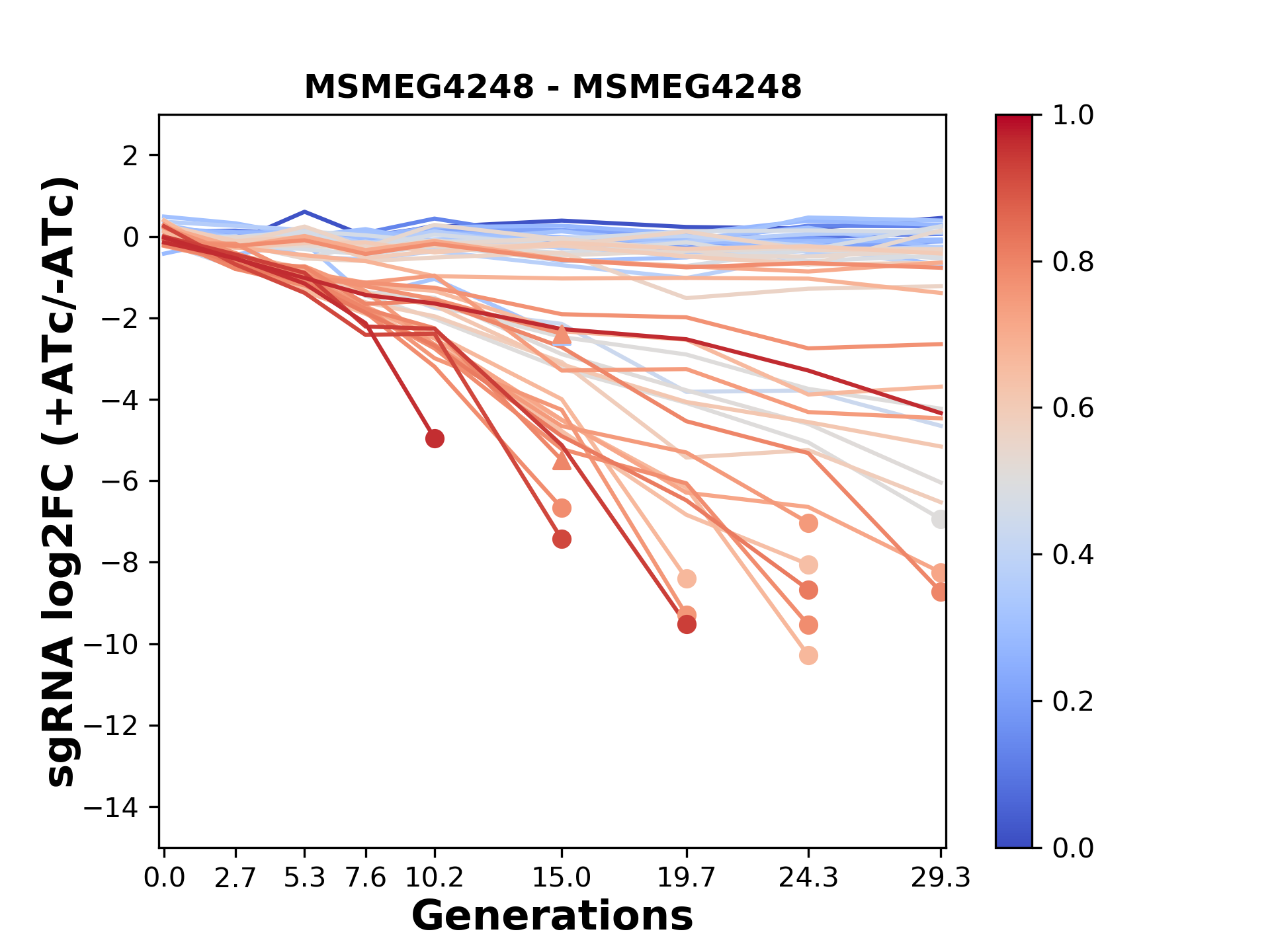 Here, we show sgRNA log2 fold-change values (L2FC) (plus versus minus ATc) over consecutive generations for sgRNAs targeting the gene you selected.