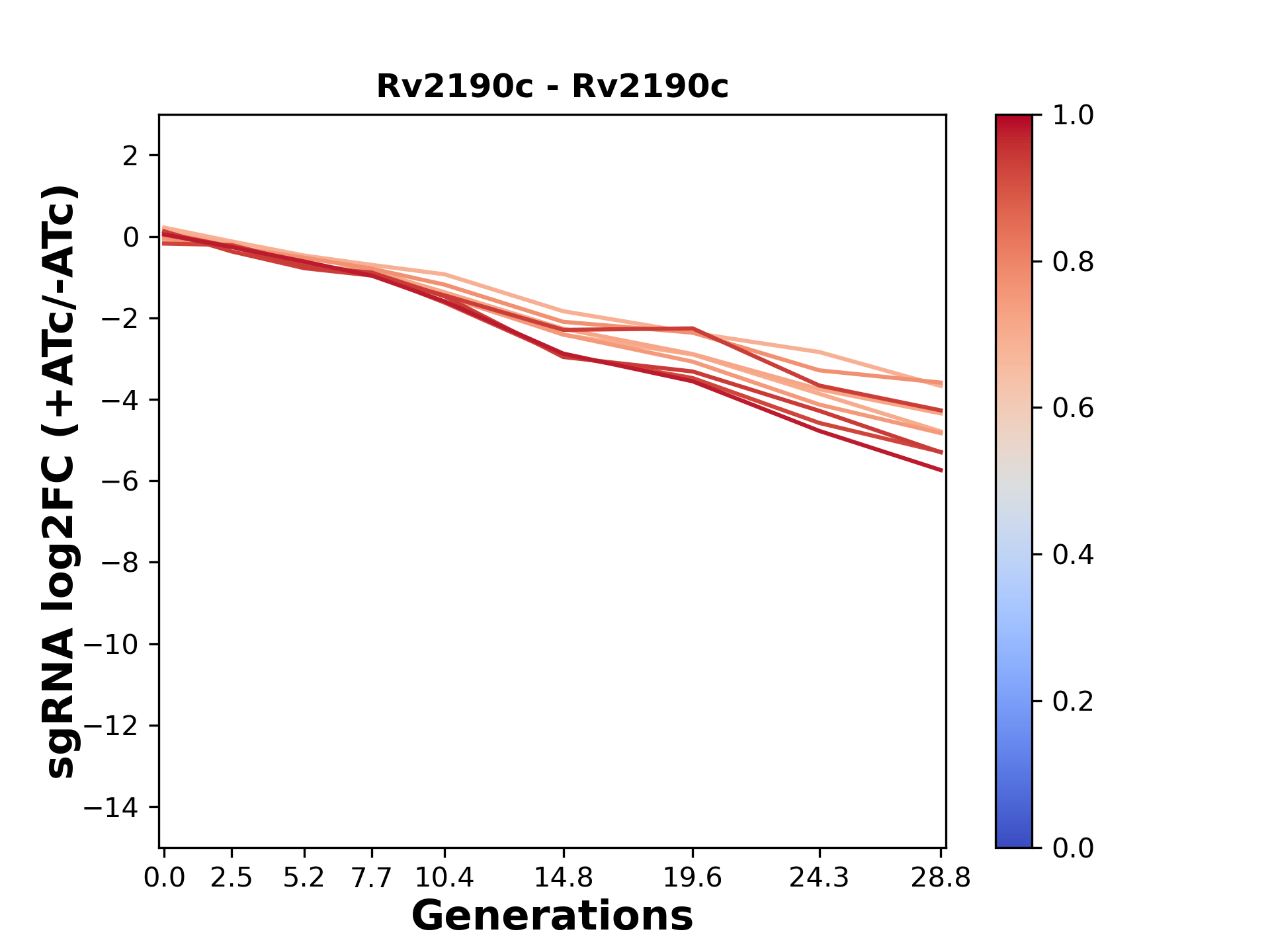 Here, we show sgRNA log2 fold-change values (L2FC) (plus versus minus ATc) over consecutive generations for sgRNAs targeting the gene you selected.