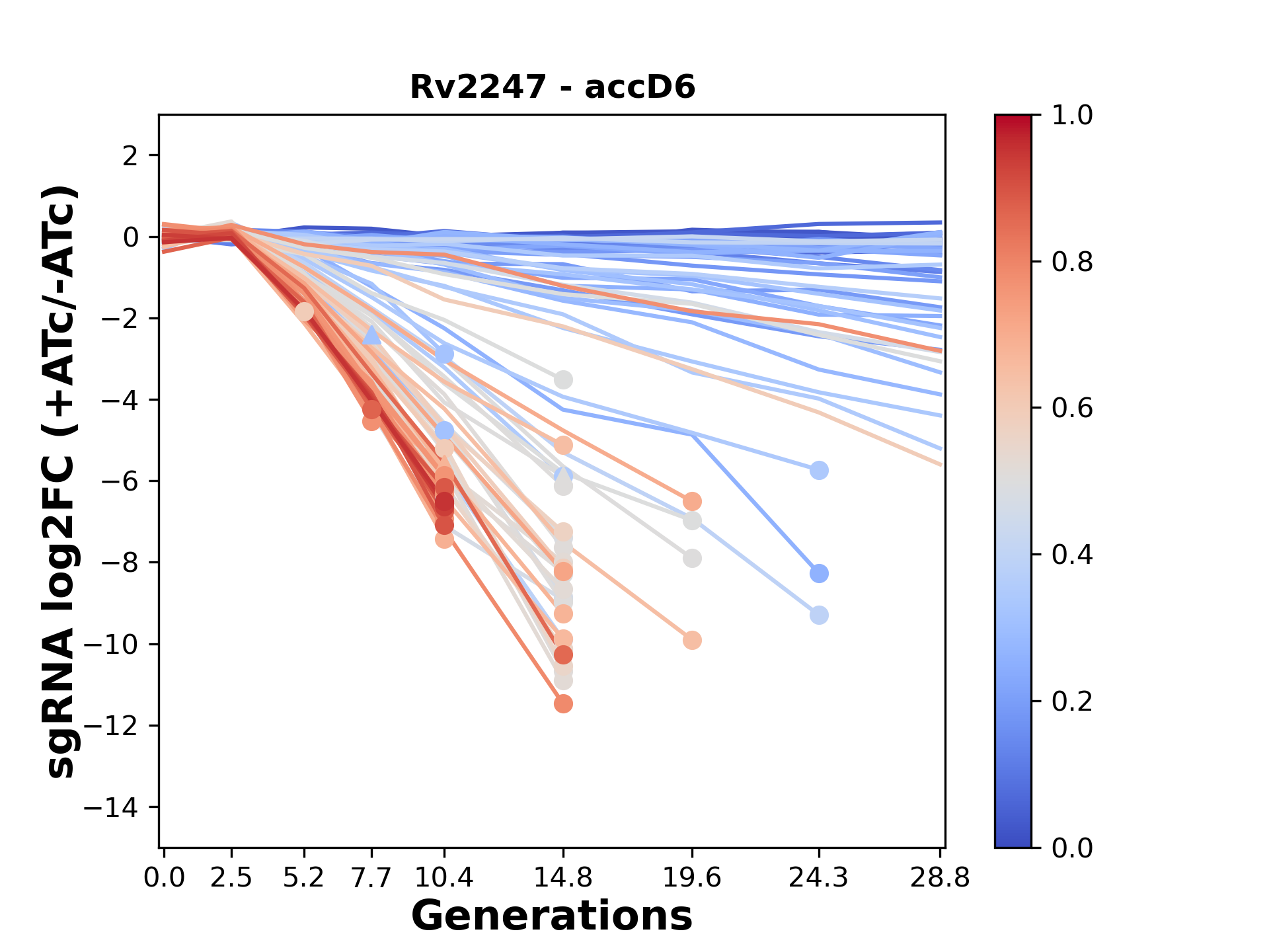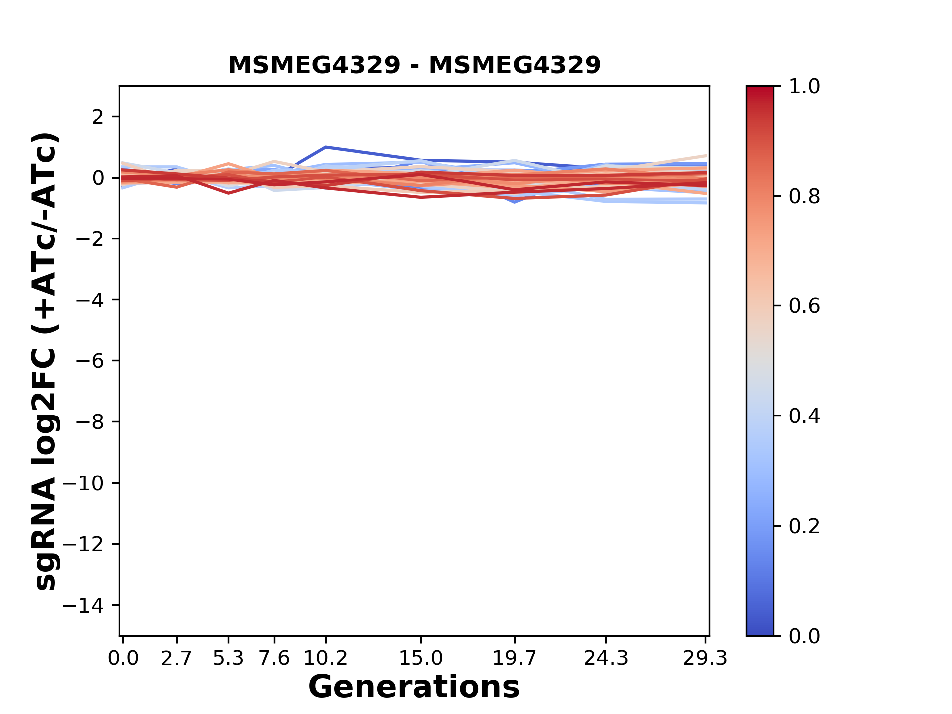 Here, we show sgRNA log2 fold-change values (L2FC) (plus versus minus ATc) over consecutive generations for sgRNAs targeting the gene you selected.