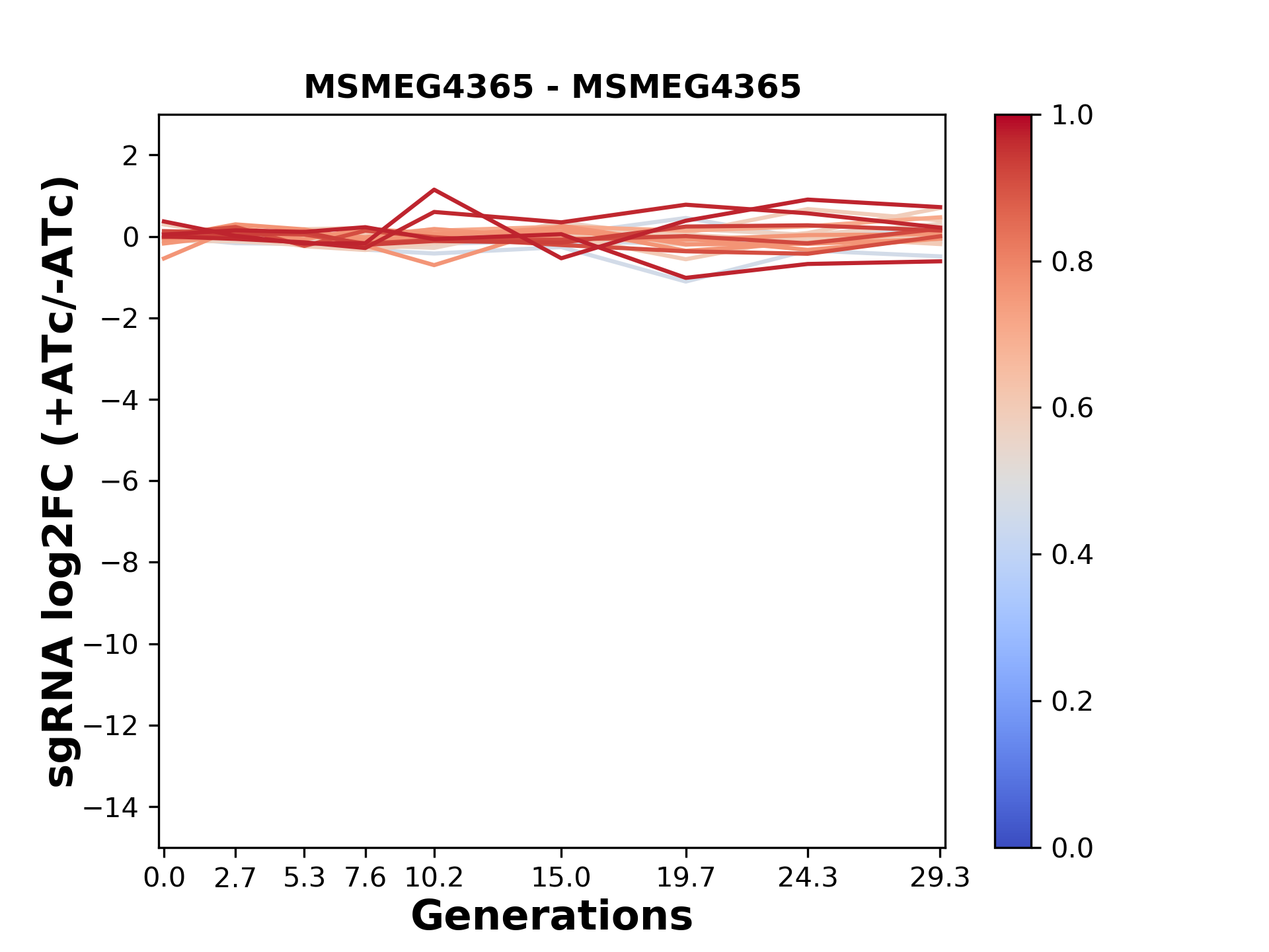 Here, we show sgRNA log2 fold-change values (L2FC) (plus versus minus ATc) over consecutive generations for sgRNAs targeting the gene you selected.