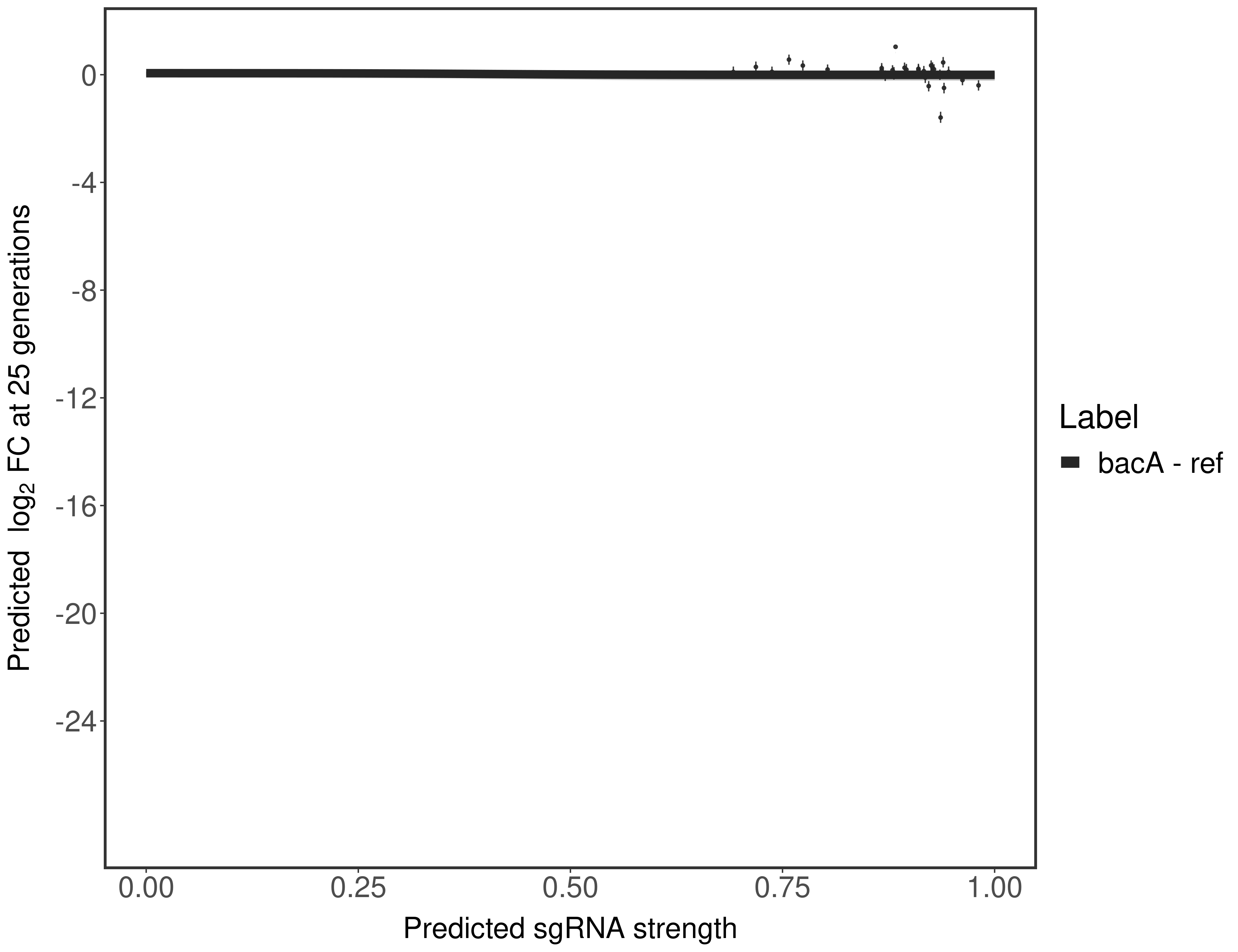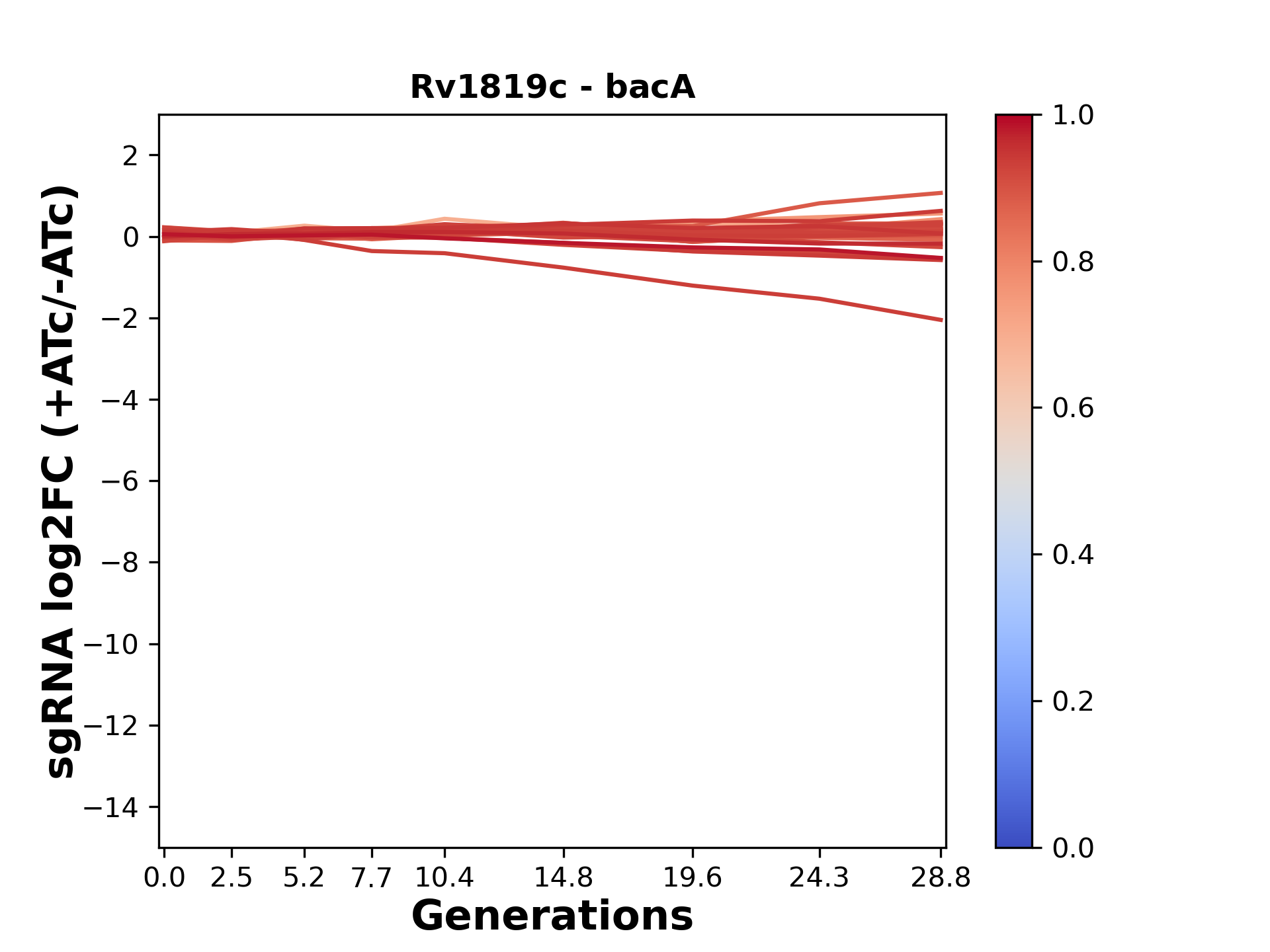 Here, we show sgRNA log2 fold-change values (L2FC) (plus versus minus ATc) over consecutive generations for sgRNAs targeting the gene you selected.
