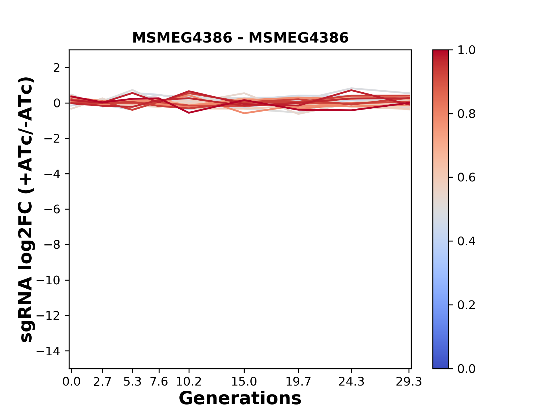 Here, we show sgRNA log2 fold-change values (L2FC) (plus versus minus ATc) over consecutive generations for sgRNAs targeting the gene you selected.