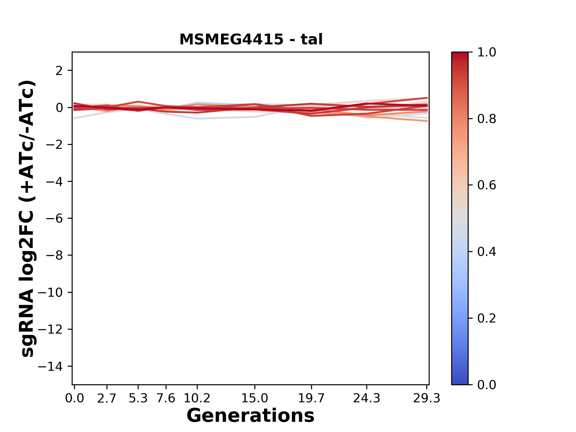 Here, we show sgRNA log2 fold-change values (L2FC) (plus versus minus ATc) over consecutive generations for sgRNAs targeting the gene you selected.