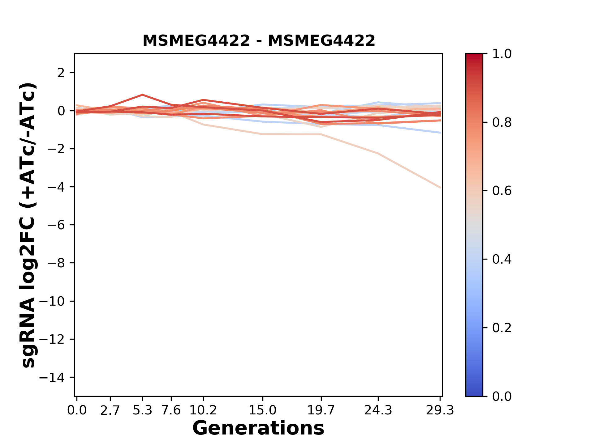 Here, we show sgRNA log2 fold-change values (L2FC) (plus versus minus ATc) over consecutive generations for sgRNAs targeting the gene you selected.