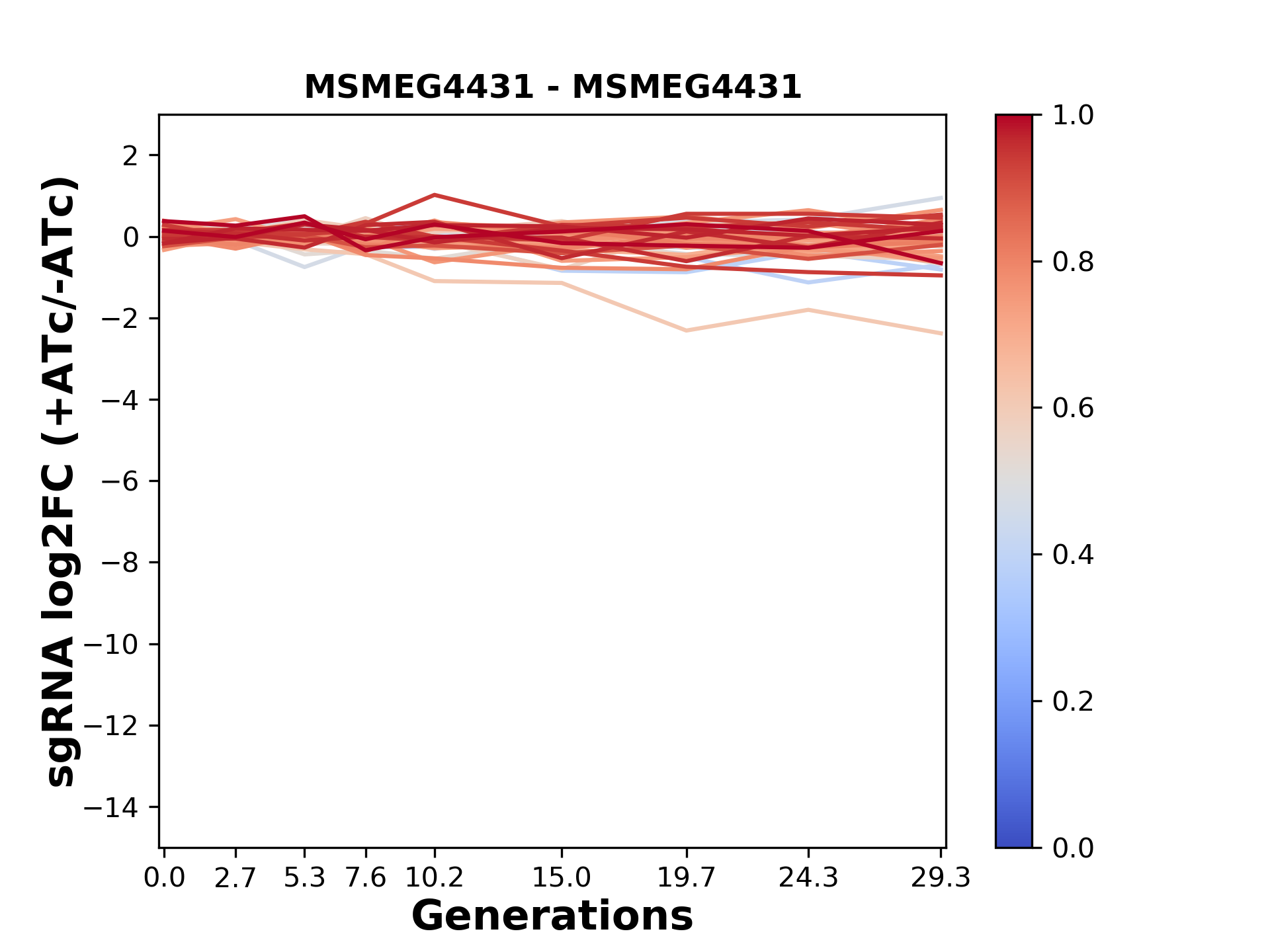Here, we show sgRNA log2 fold-change values (L2FC) (plus versus minus ATc) over consecutive generations for sgRNAs targeting the gene you selected.