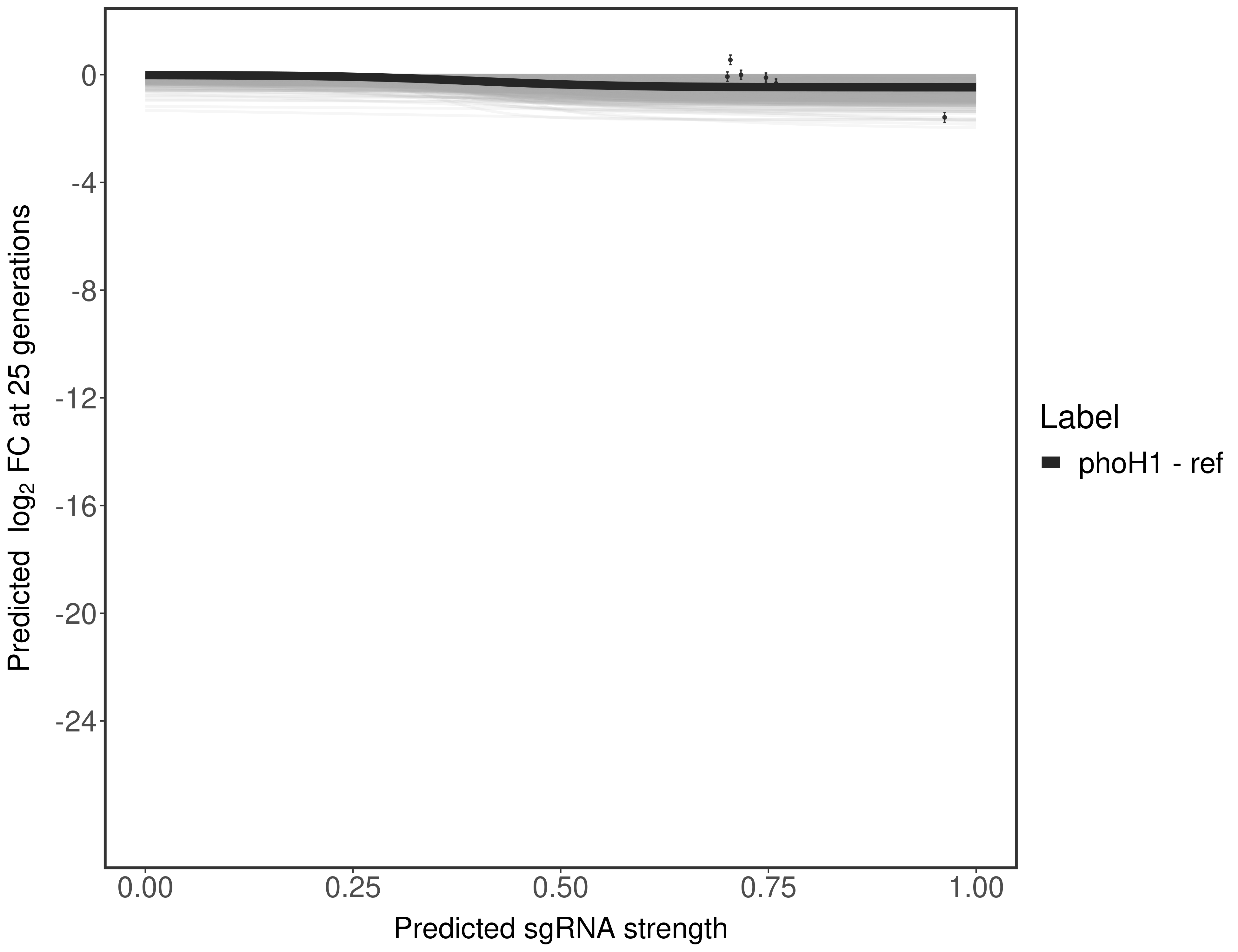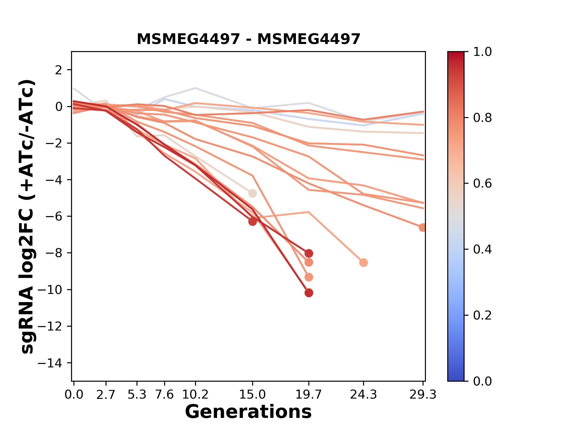 Here, we show sgRNA log2 fold-change values (L2FC) (plus versus minus ATc) over consecutive generations for sgRNAs targeting the gene you selected.