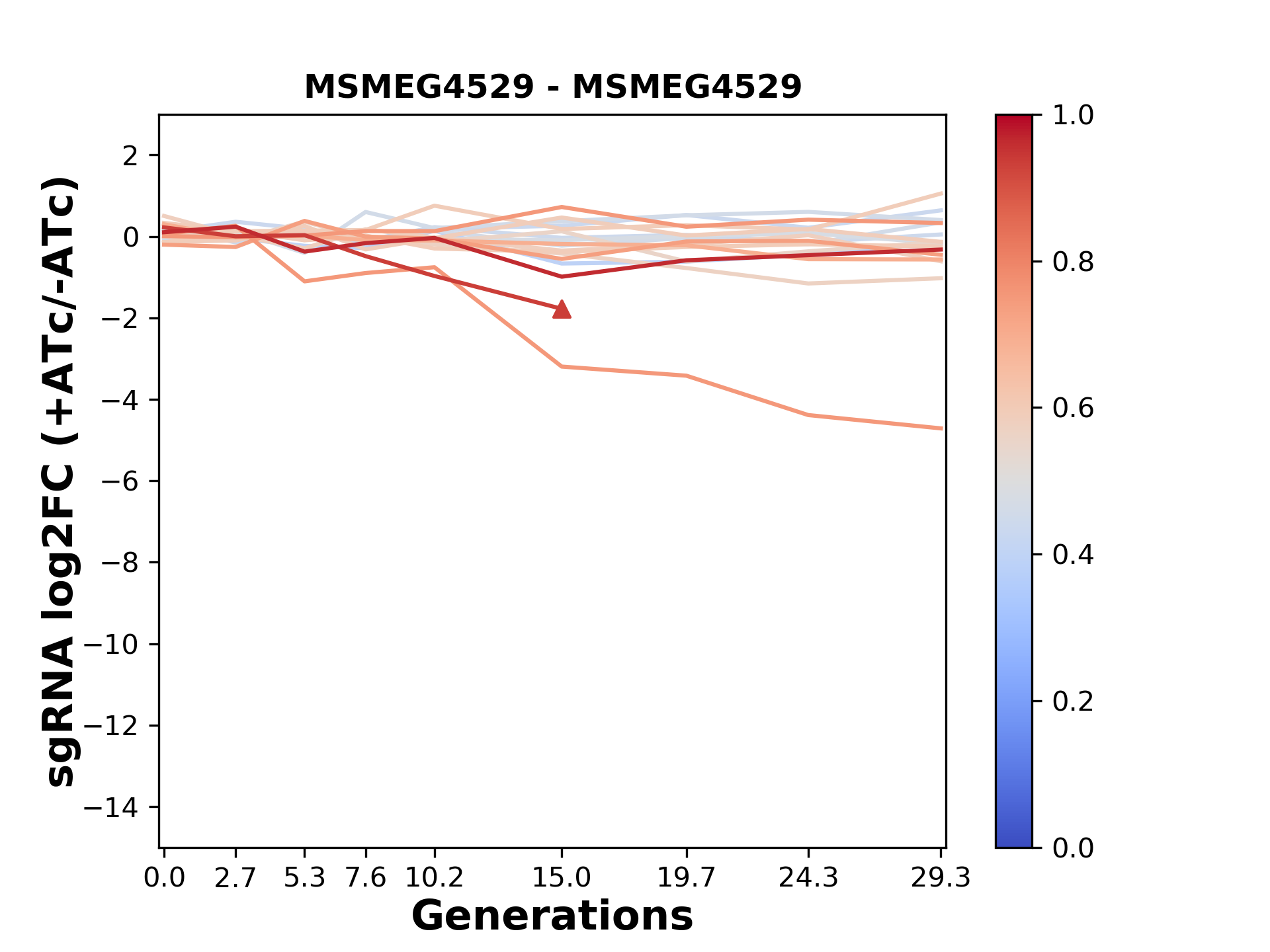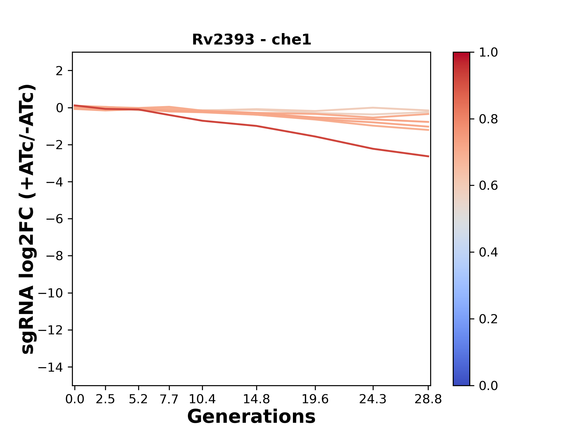 Here, we show sgRNA log2 fold-change values (L2FC) (plus versus minus ATc) over consecutive generations for sgRNAs targeting the gene you selected.
