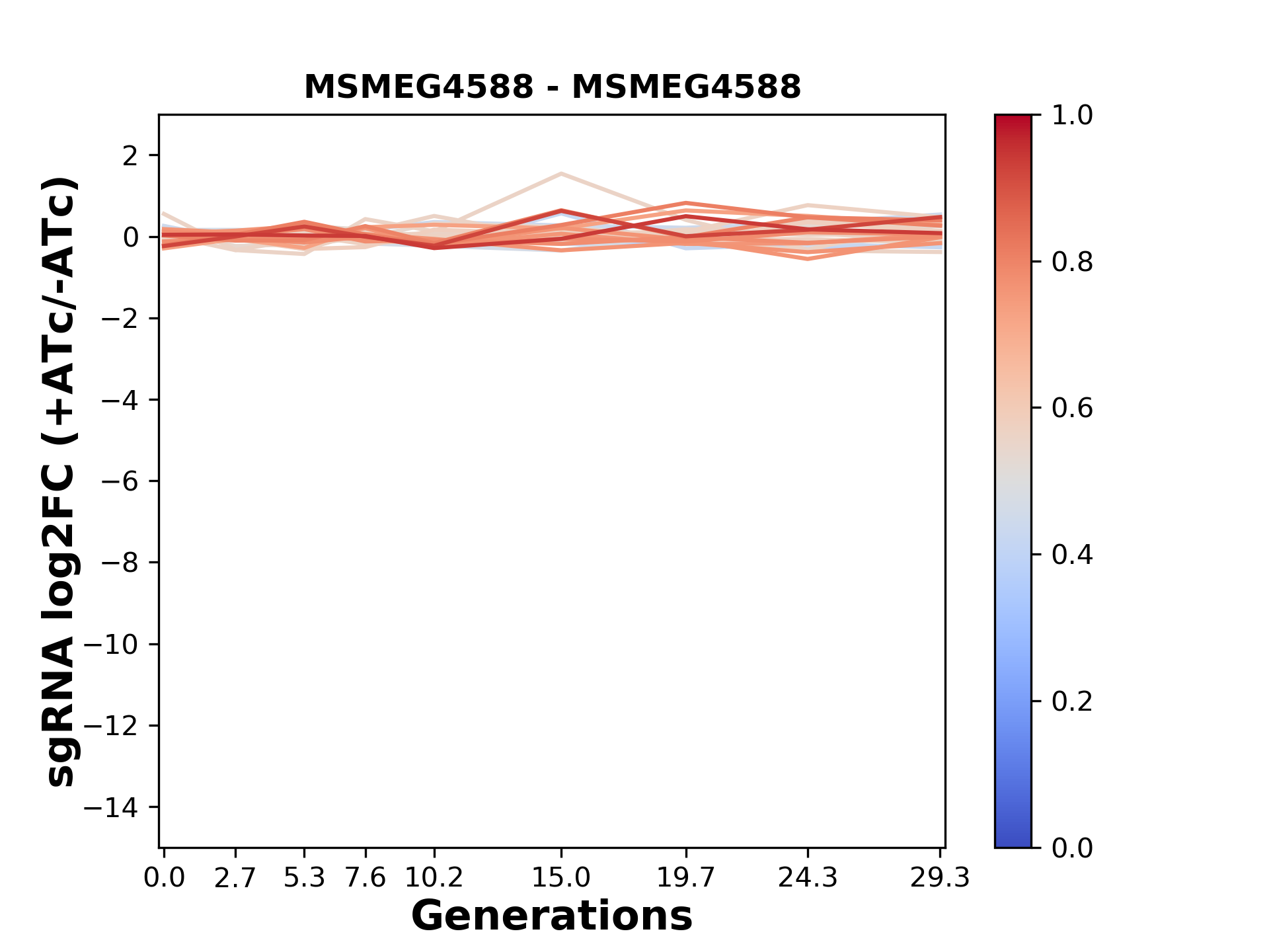 Here, we show sgRNA log2 fold-change values (L2FC) (plus versus minus ATc) over consecutive generations for sgRNAs targeting the gene you selected.