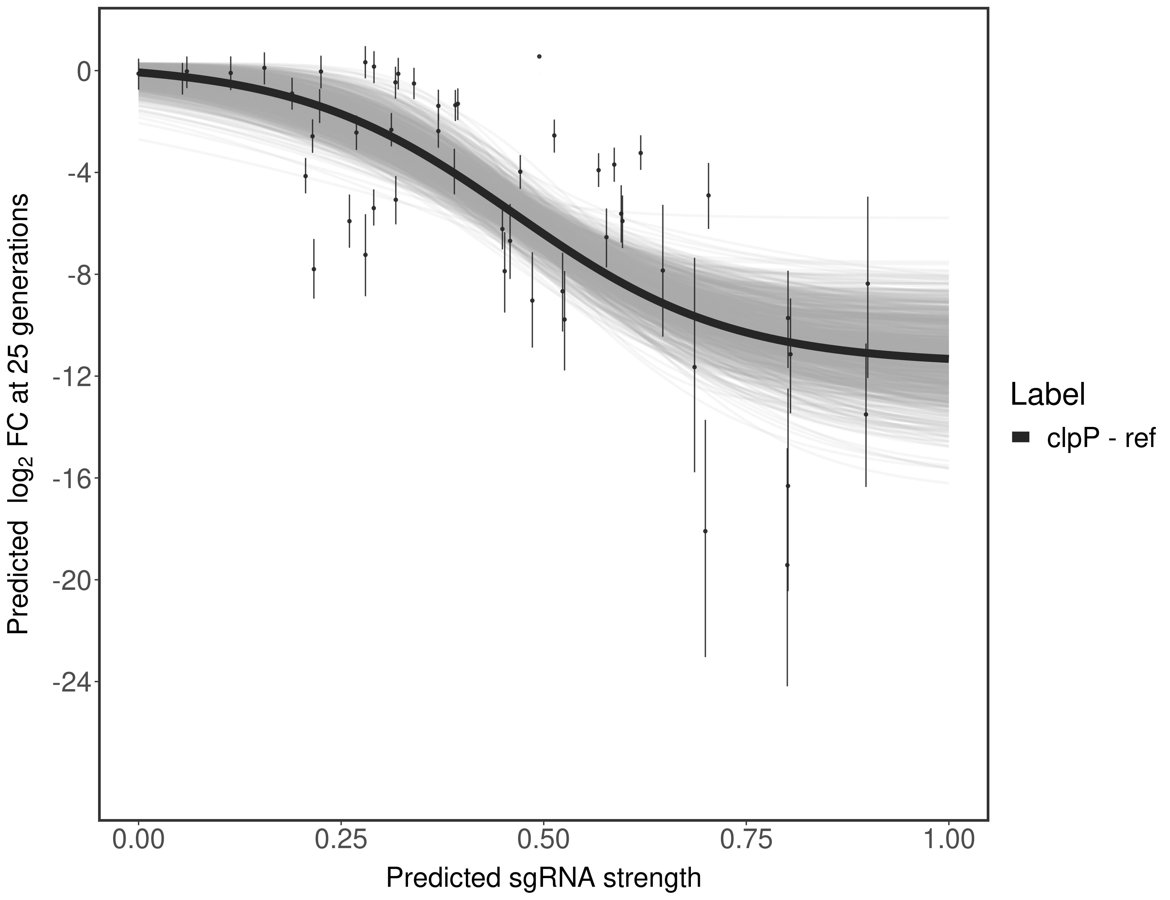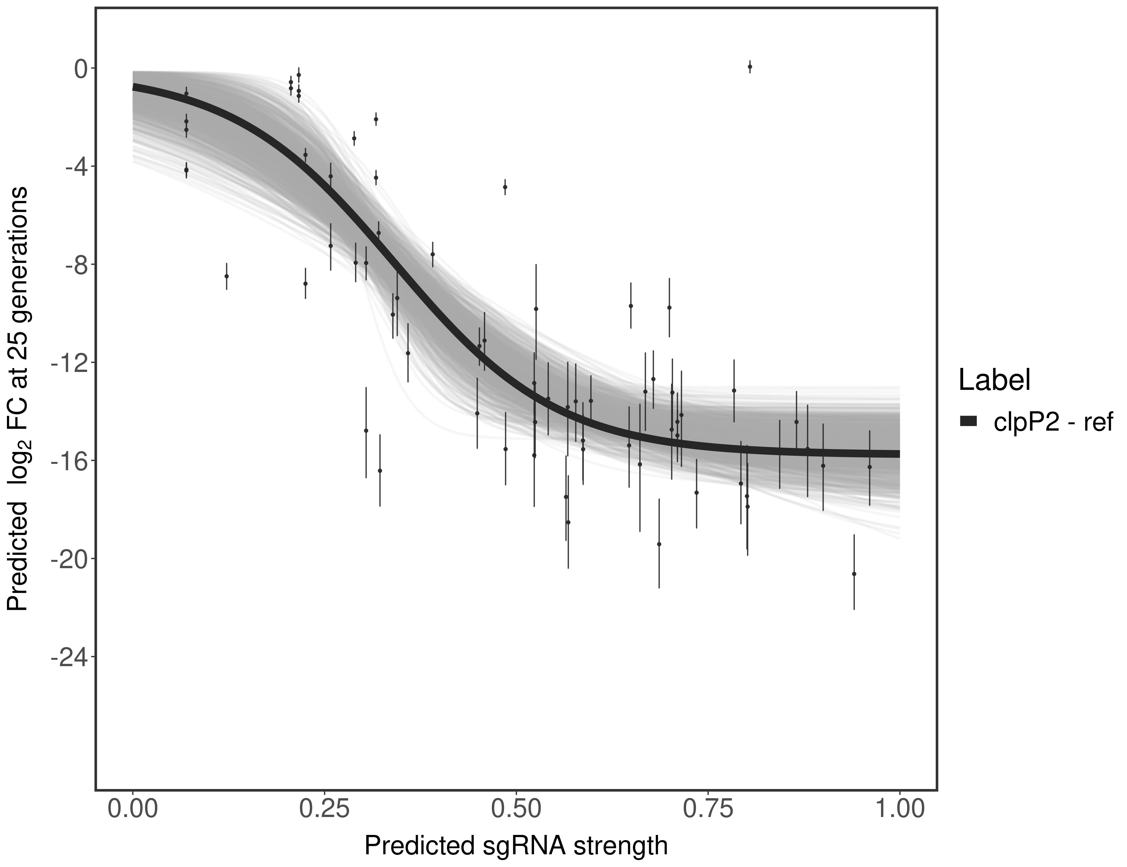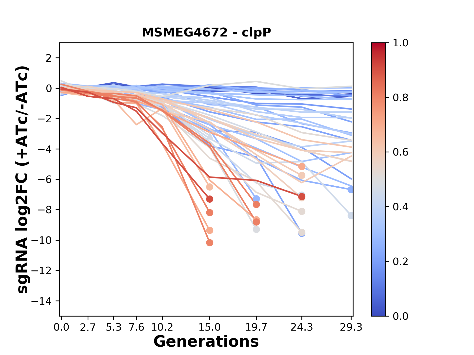 Here, we show sgRNA log2 fold-change values (L2FC) (plus versus minus ATc) over consecutive generations for sgRNAs targeting the gene you selected.