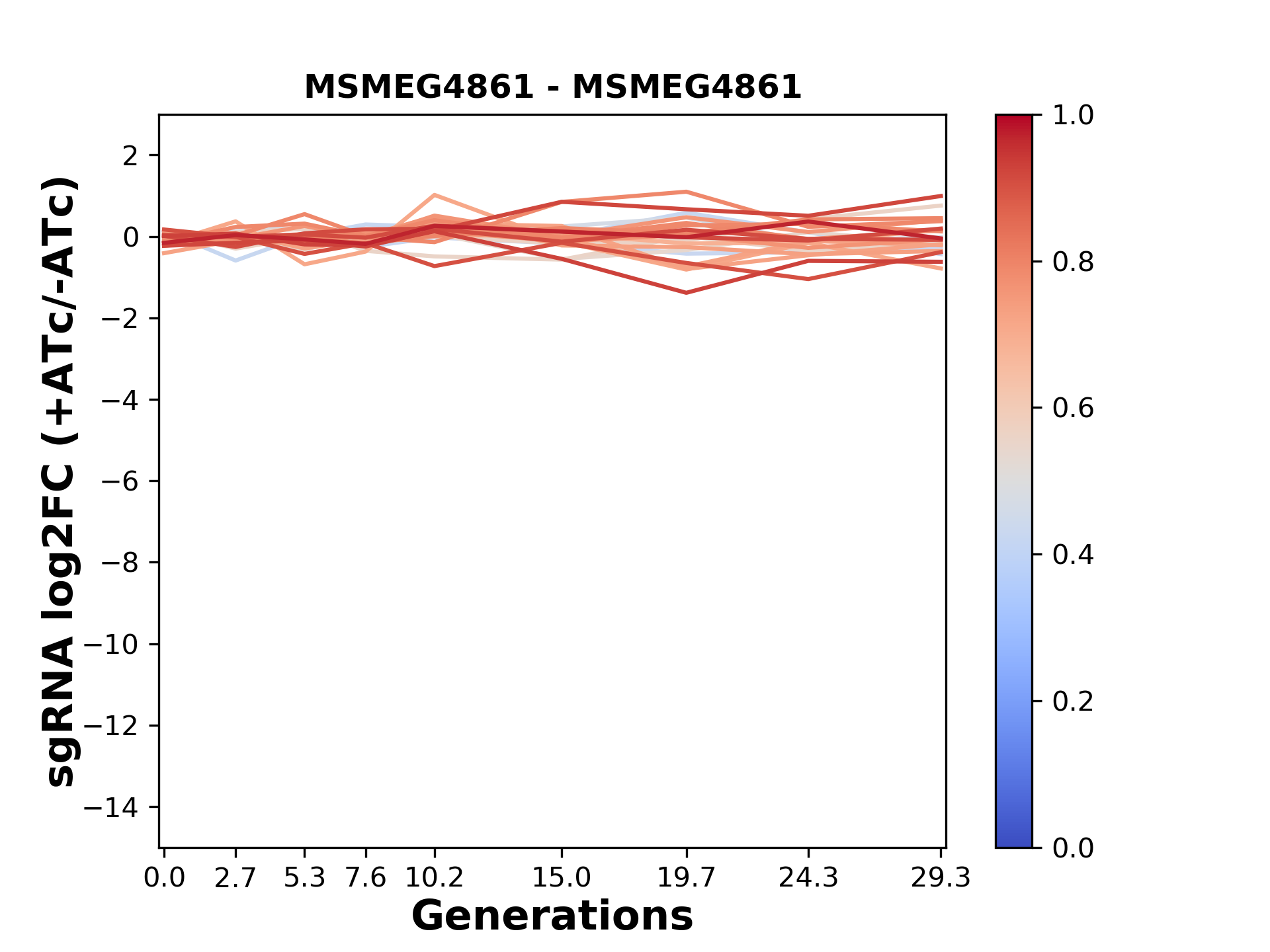 Here, we show sgRNA log2 fold-change values (L2FC) (plus versus minus ATc) over consecutive generations for sgRNAs targeting the gene you selected.