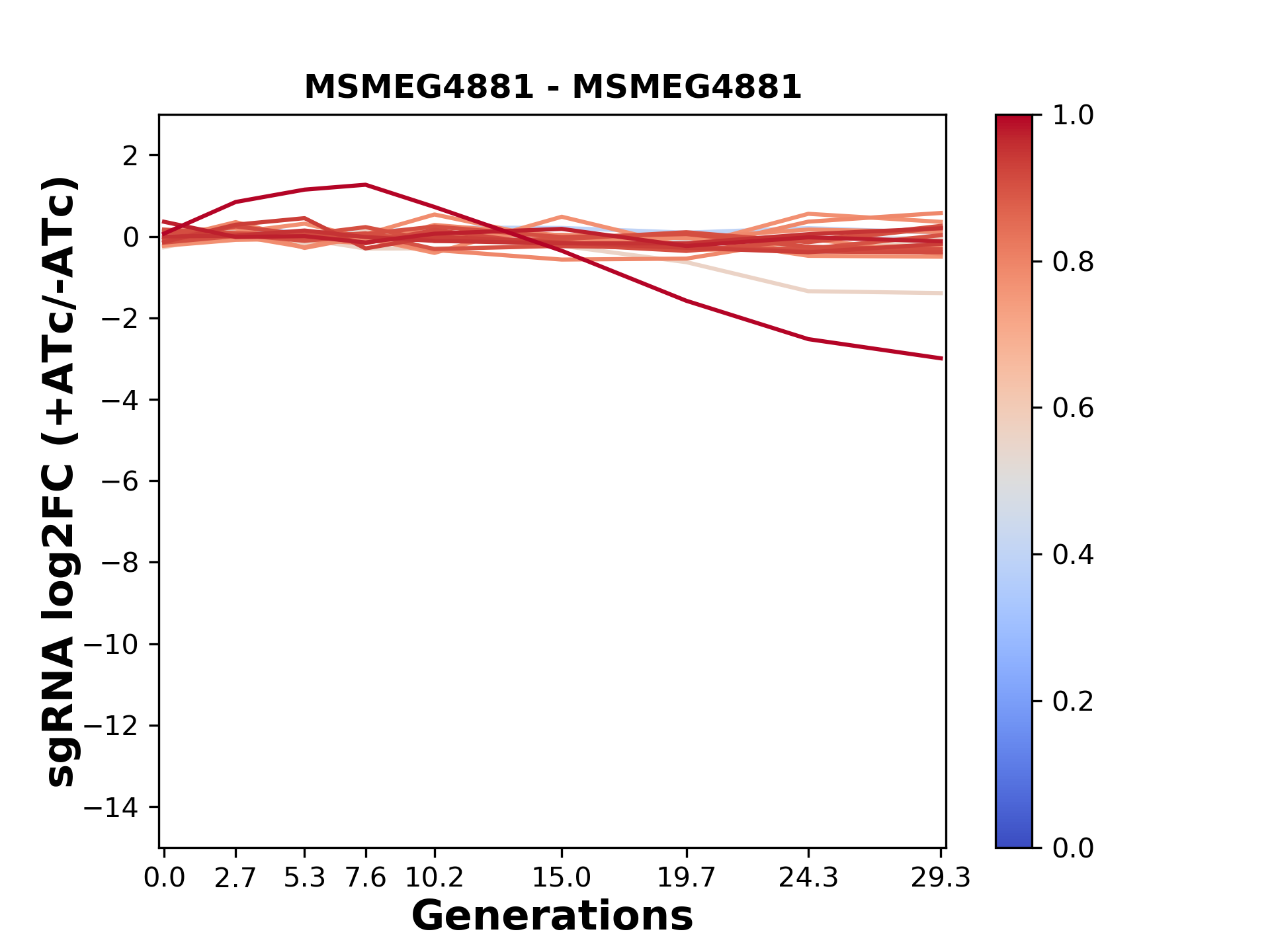 Here, we show sgRNA log2 fold-change values (L2FC) (plus versus minus ATc) over consecutive generations for sgRNAs targeting the gene you selected.
