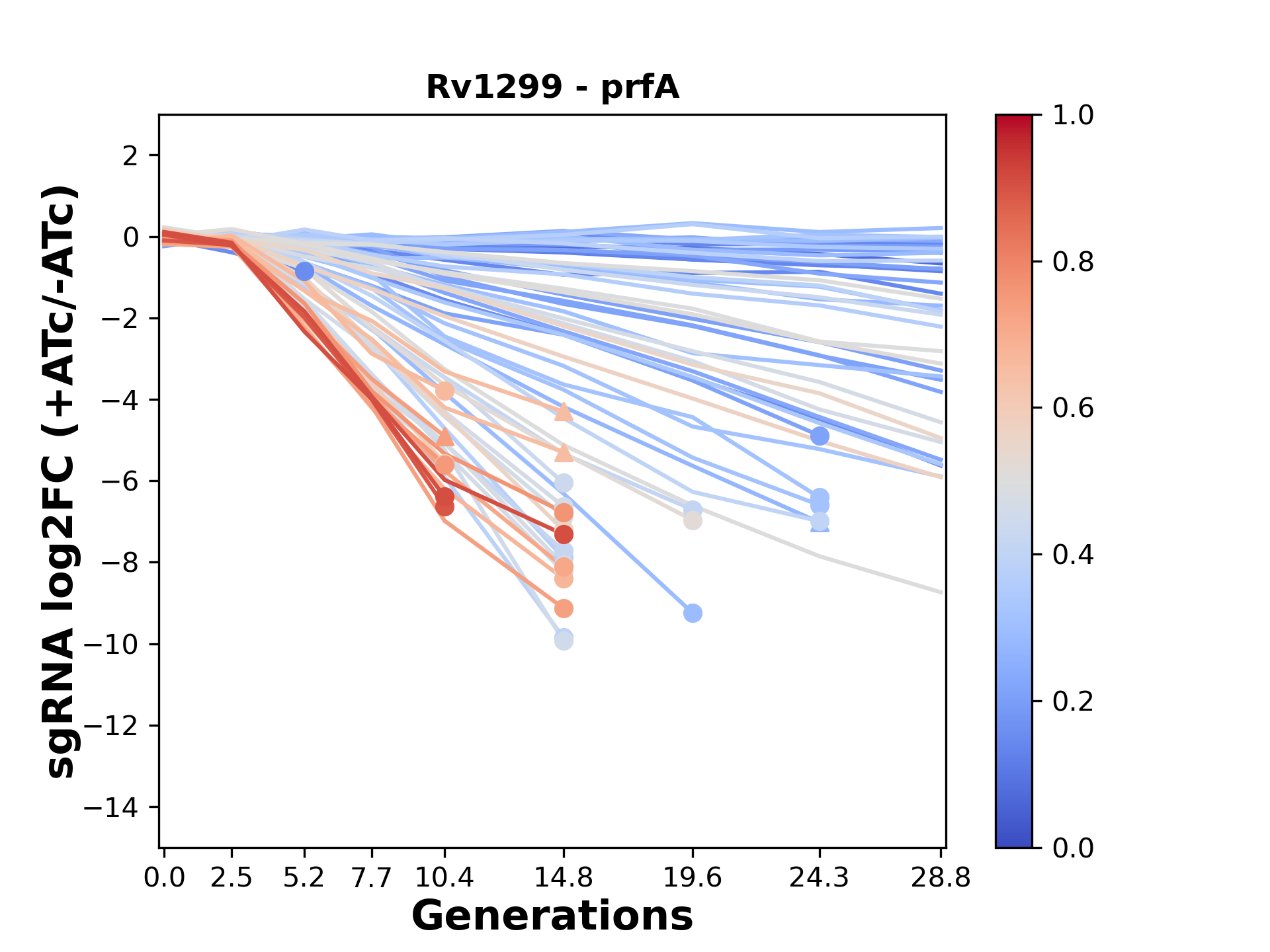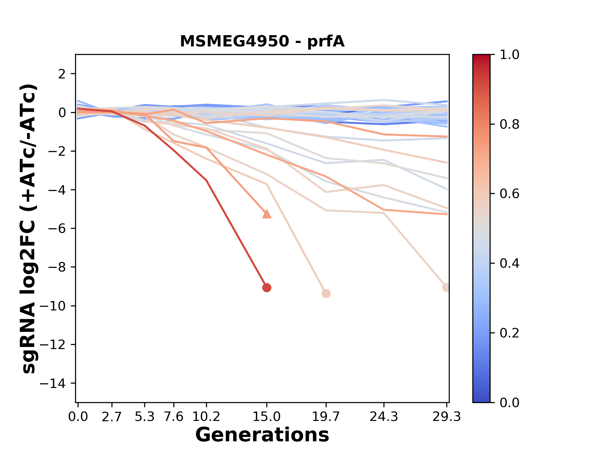 Here, we show sgRNA log2 fold-change values (L2FC) (plus versus minus ATc) over consecutive generations for sgRNAs targeting the gene you selected.