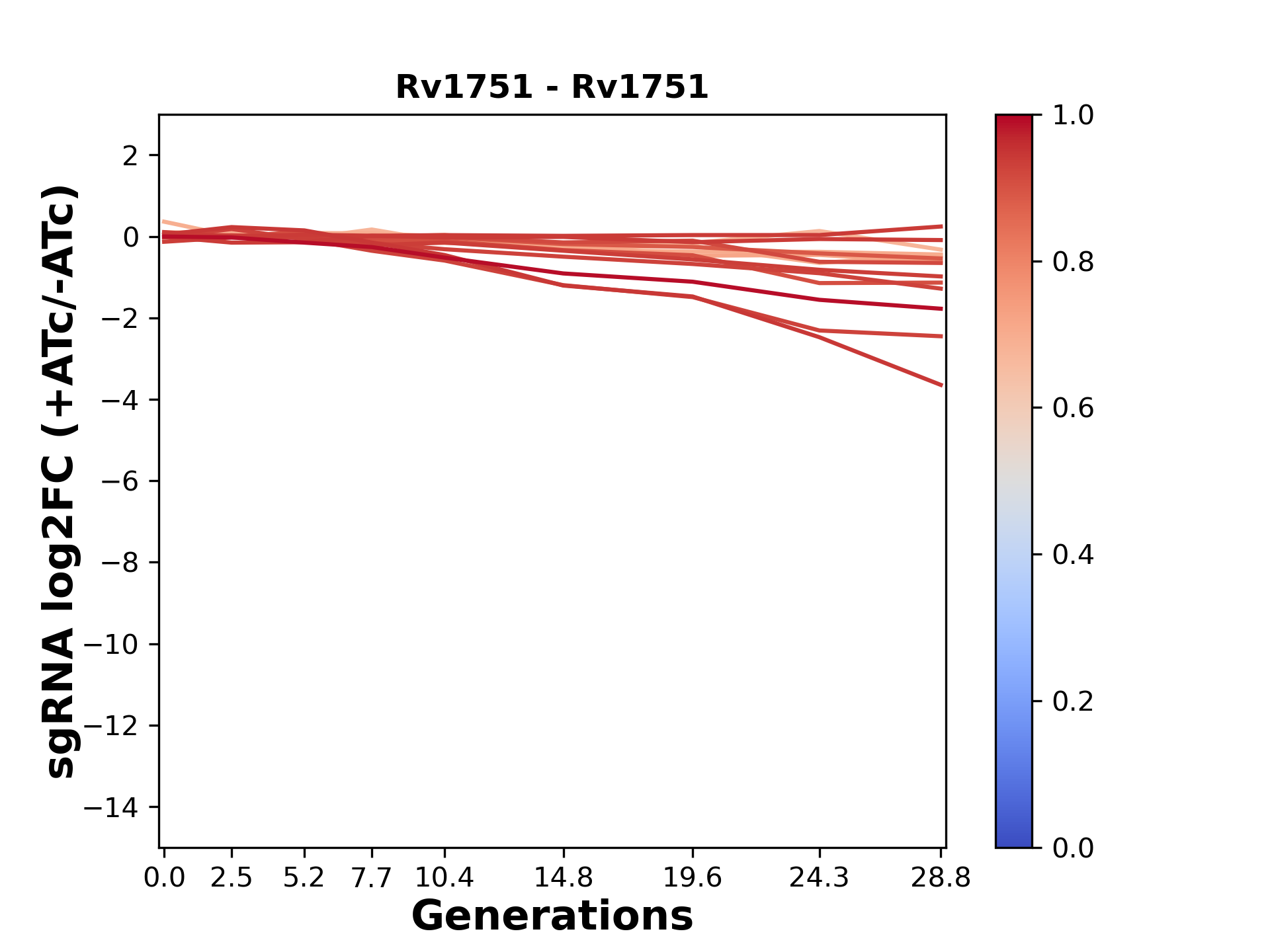 Here, we show sgRNA log2 fold-change values (L2FC) (plus versus minus ATc) over consecutive generations for sgRNAs targeting the gene you selected.