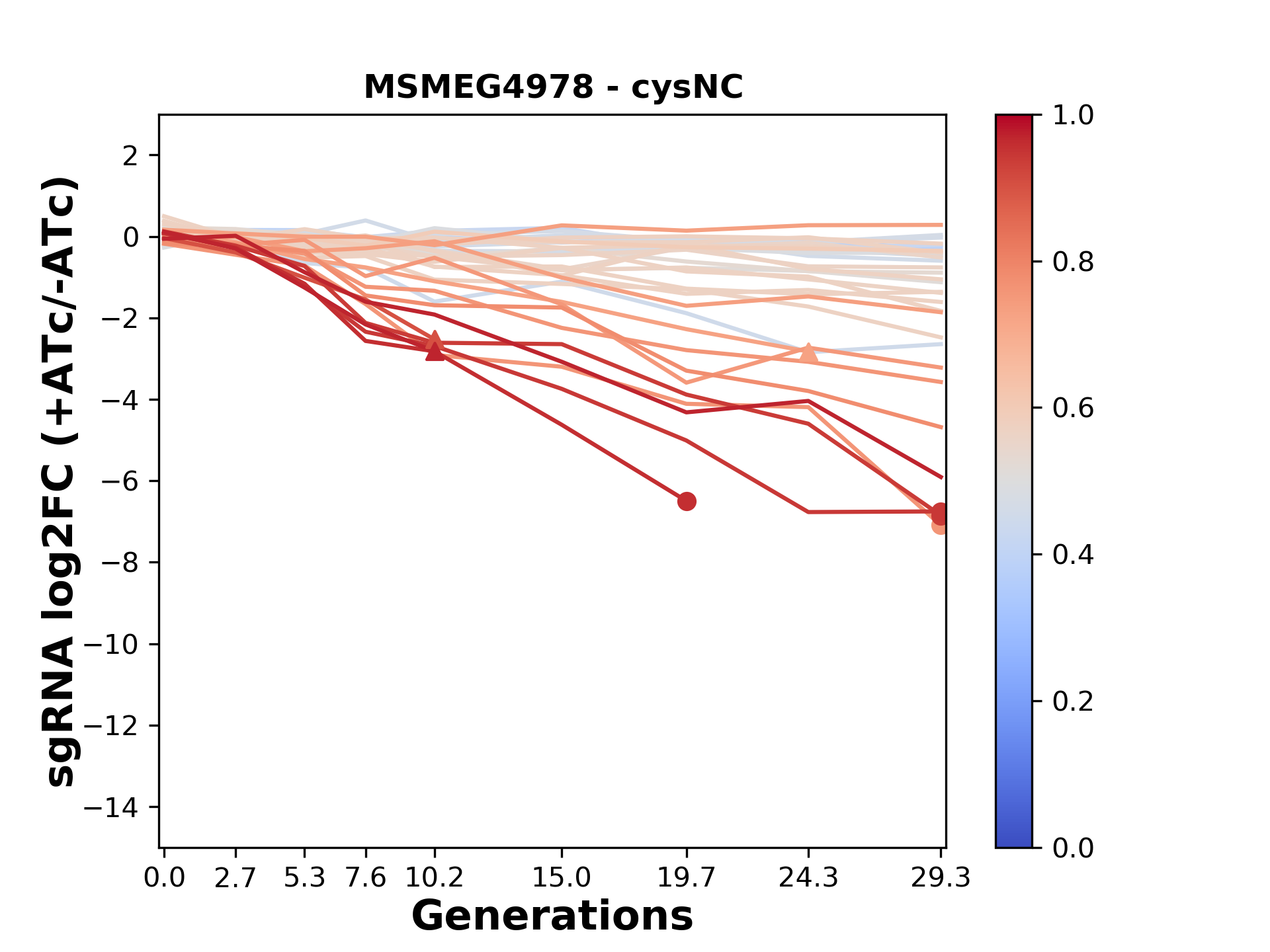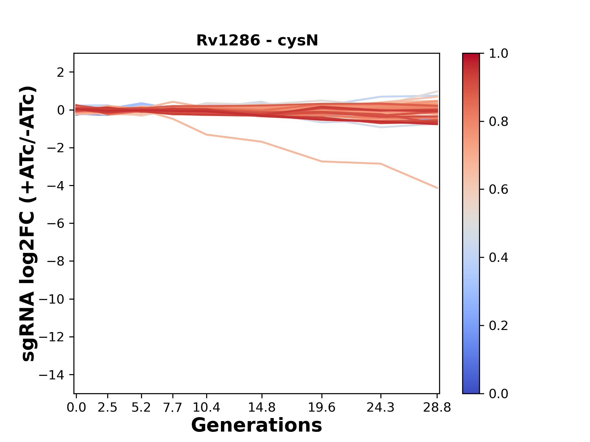 Here, we show sgRNA log2 fold-change values (L2FC) (plus versus minus ATc) over consecutive generations for sgRNAs targeting the gene you selected.