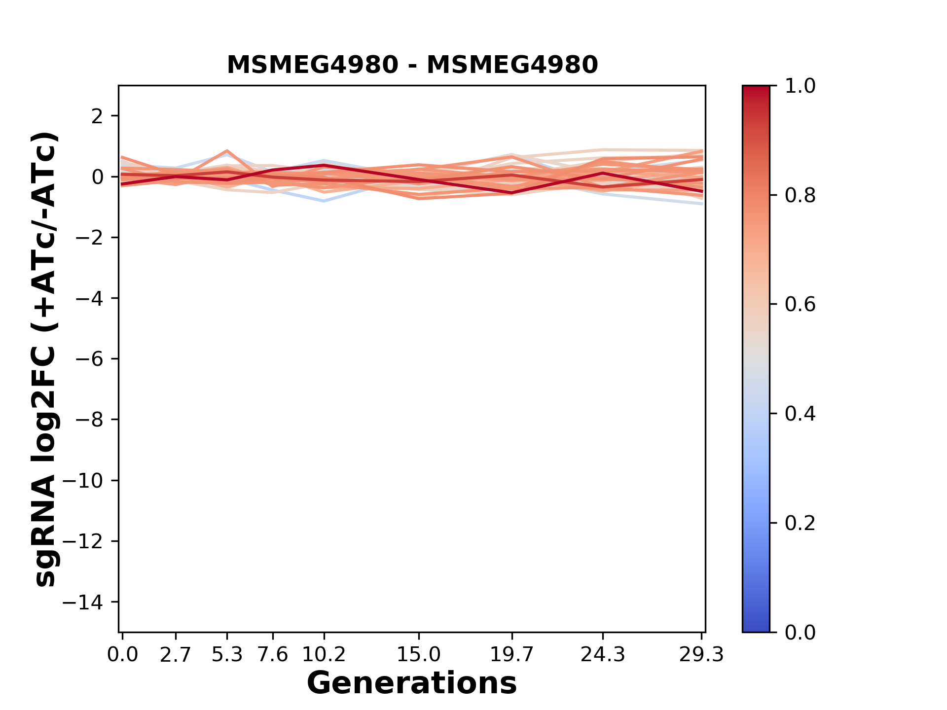 Here, we show sgRNA log2 fold-change values (L2FC) (plus versus minus ATc) over consecutive generations for sgRNAs targeting the gene you selected.
