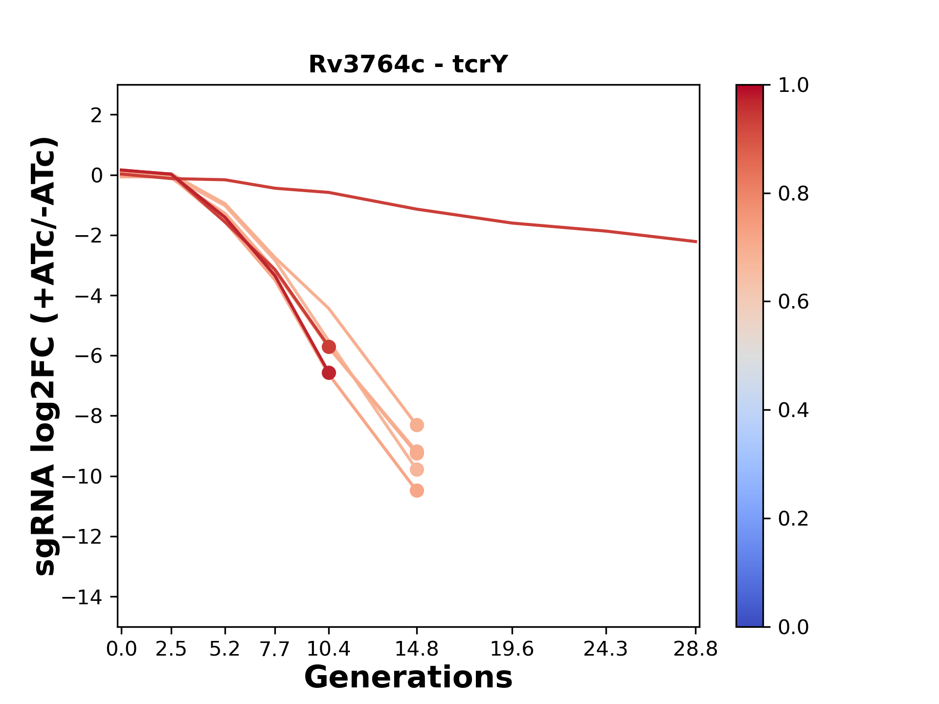Here, we show sgRNA log2 fold-change values (L2FC) (plus versus minus ATc) over consecutive generations for sgRNAs targeting the gene you selected.