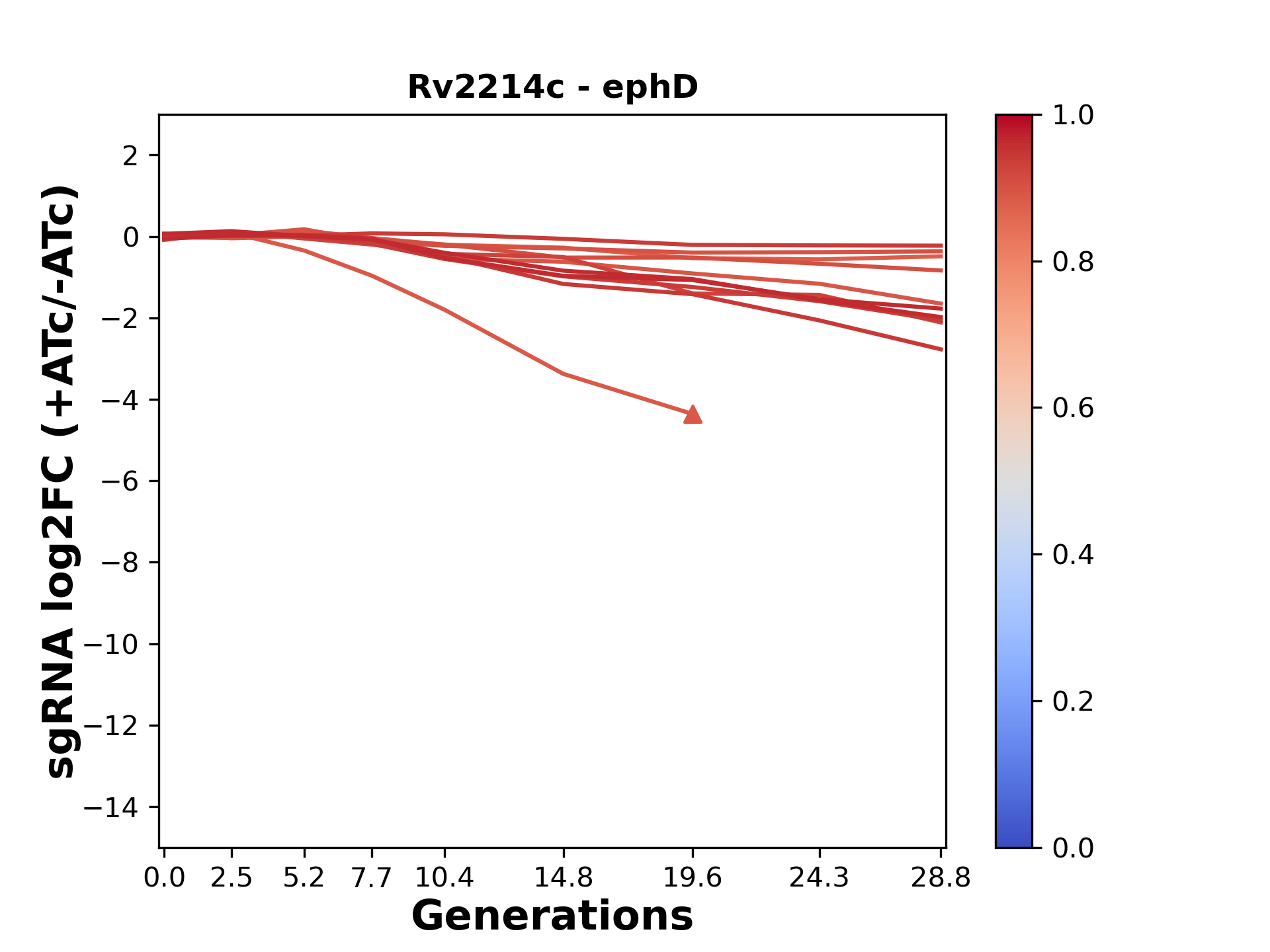 Here, we show sgRNA log2 fold-change values (L2FC) (plus versus minus ATc) over consecutive generations for sgRNAs targeting the gene you selected.