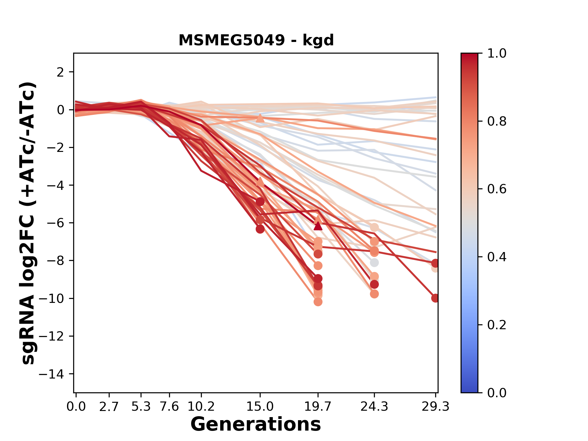 Here, we show sgRNA log2 fold-change values (L2FC) (plus versus minus ATc) over consecutive generations for sgRNAs targeting the gene you selected.