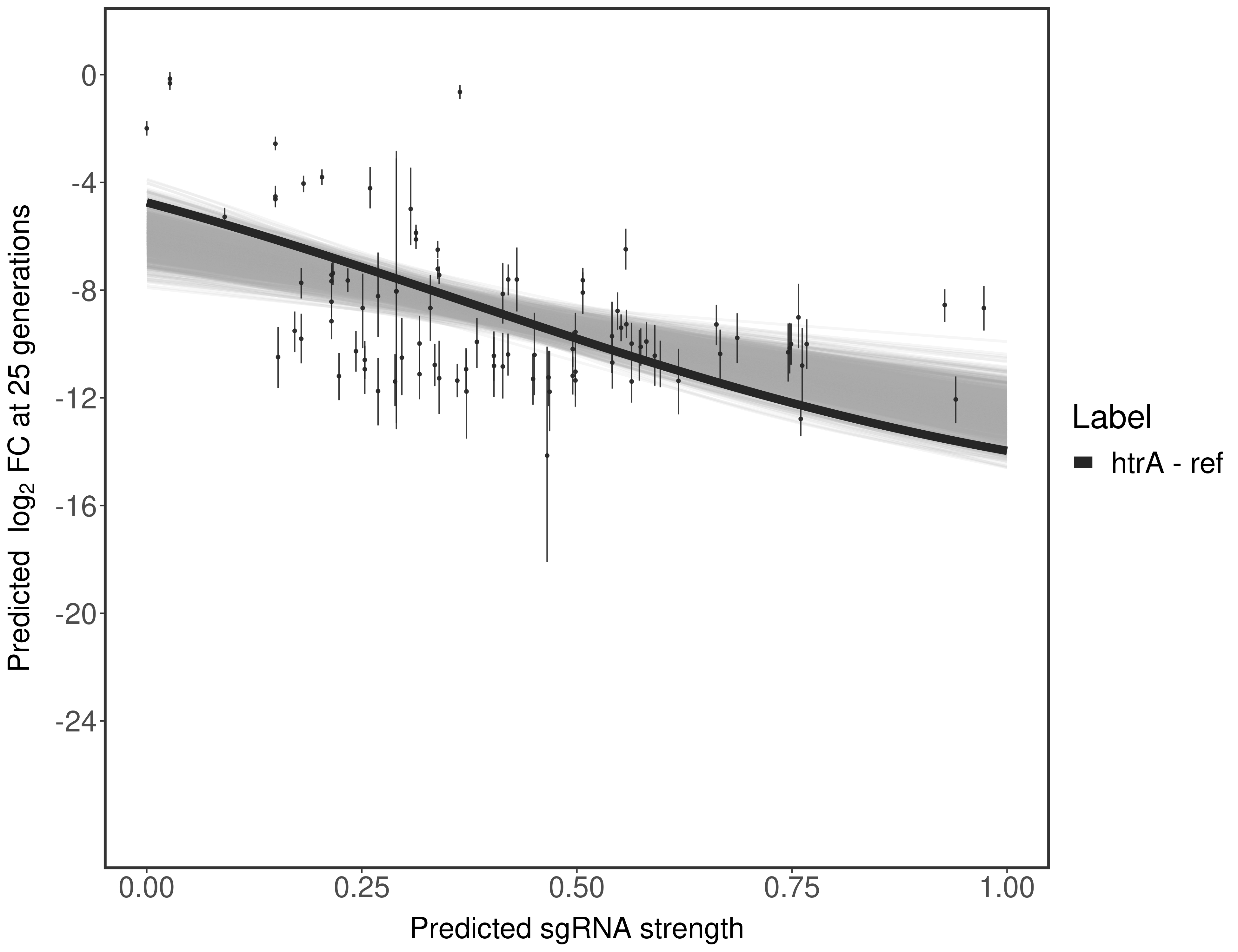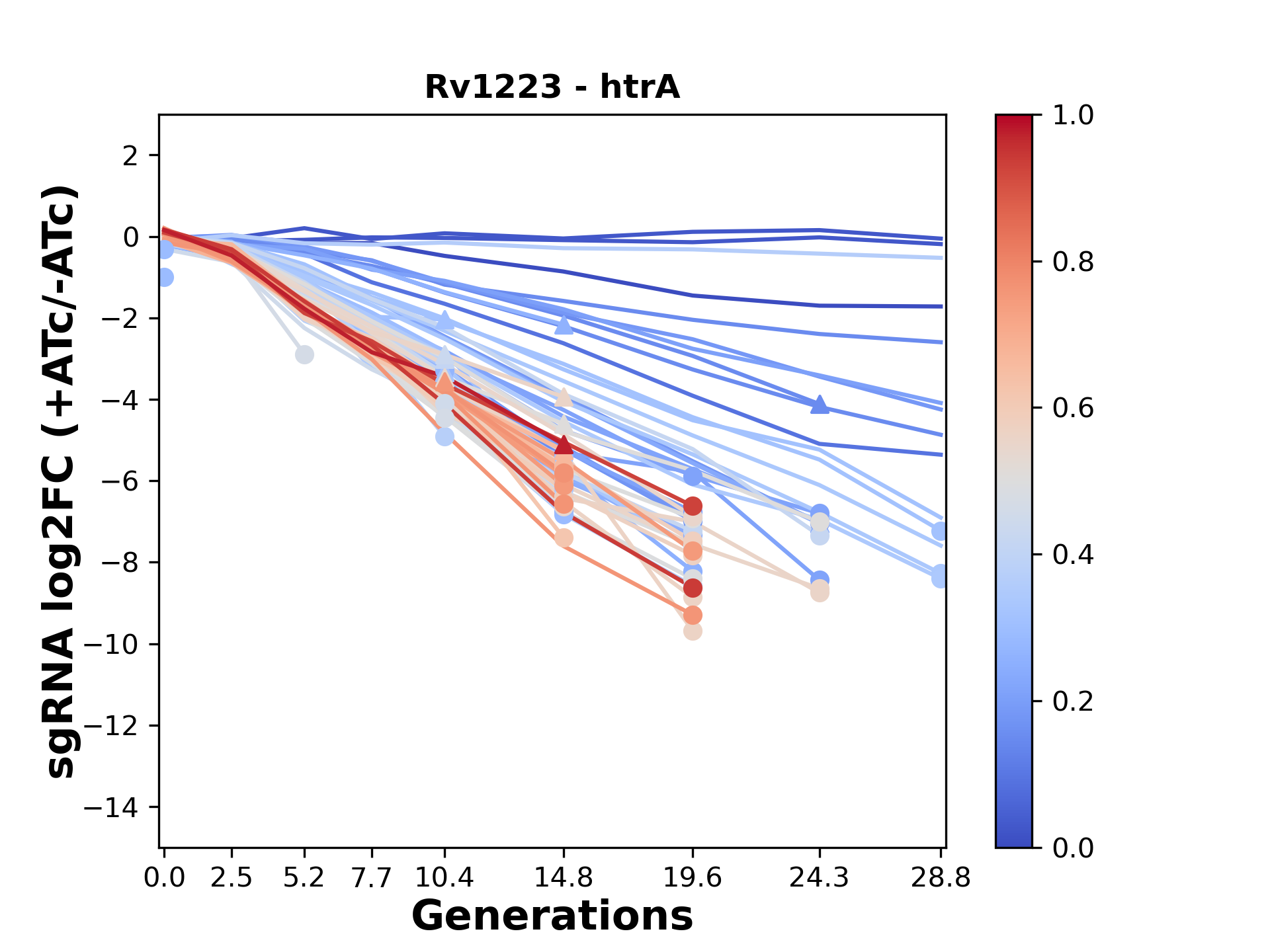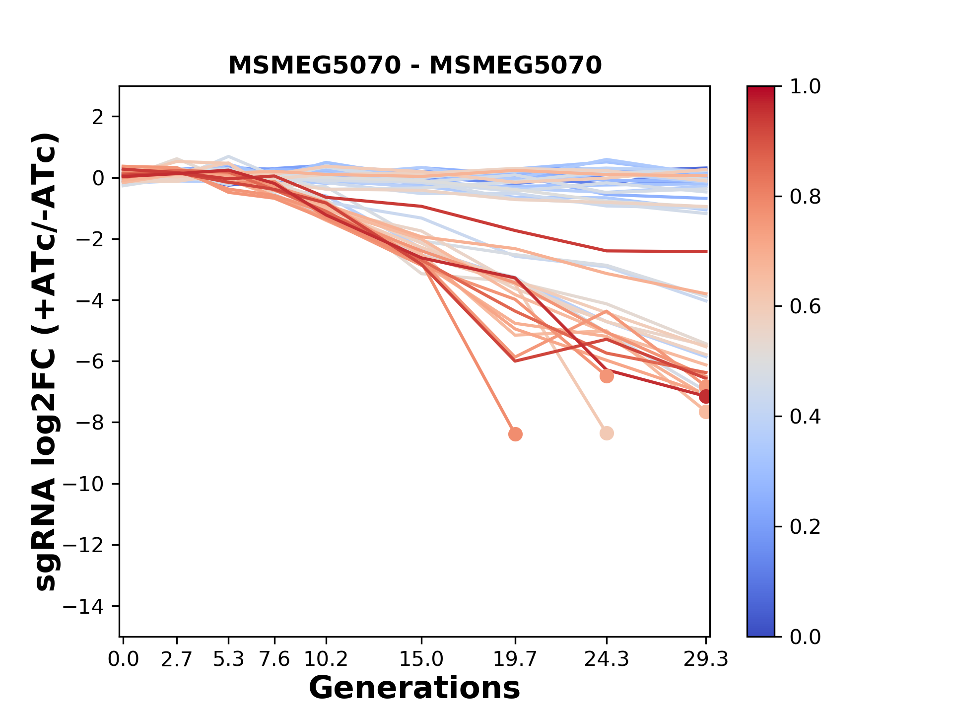 Here, we show sgRNA log2 fold-change values (L2FC) (plus versus minus ATc) over consecutive generations for sgRNAs targeting the gene you selected.