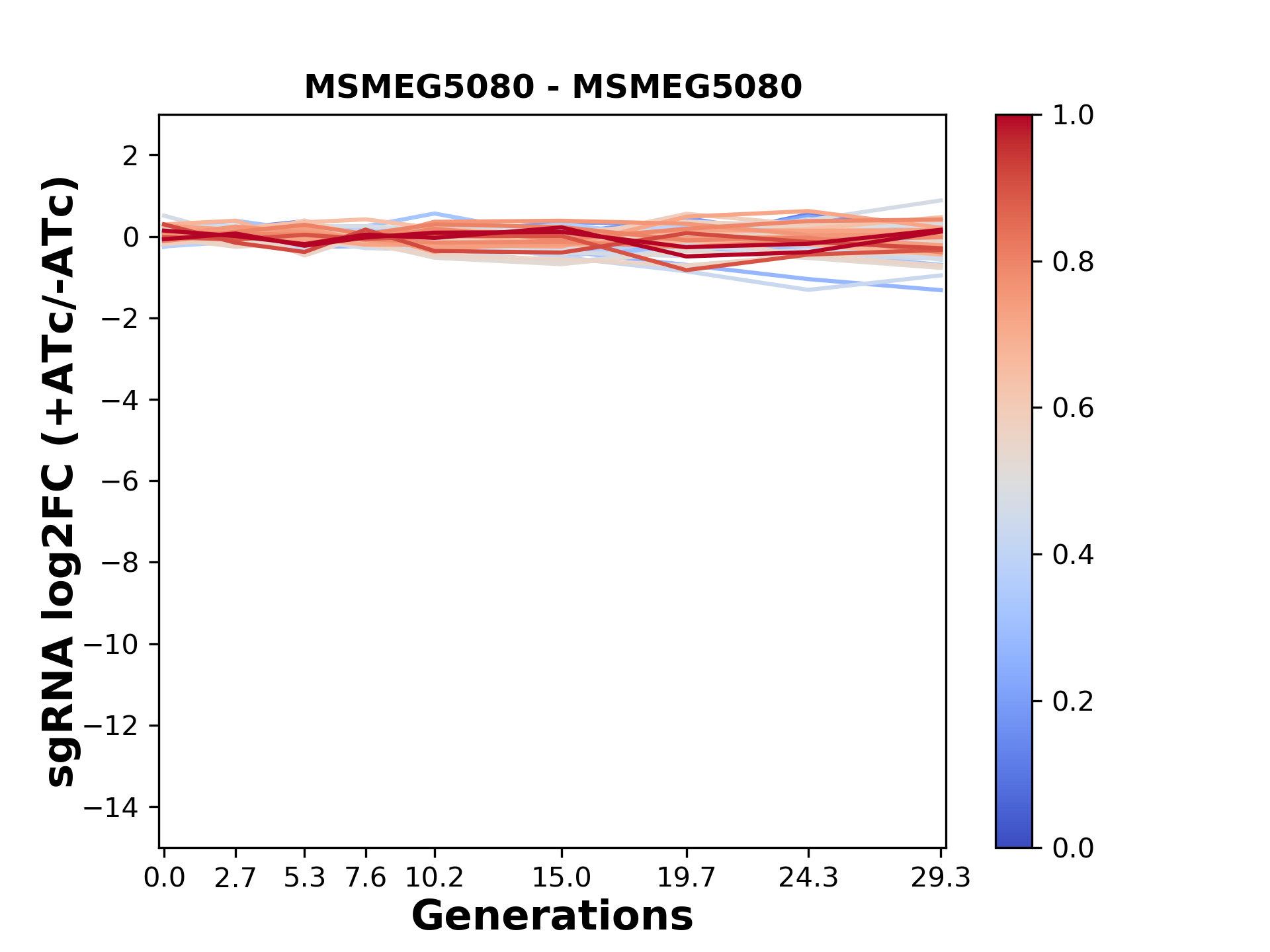 Here, we show sgRNA log2 fold-change values (L2FC) (plus versus minus ATc) over consecutive generations for sgRNAs targeting the gene you selected.