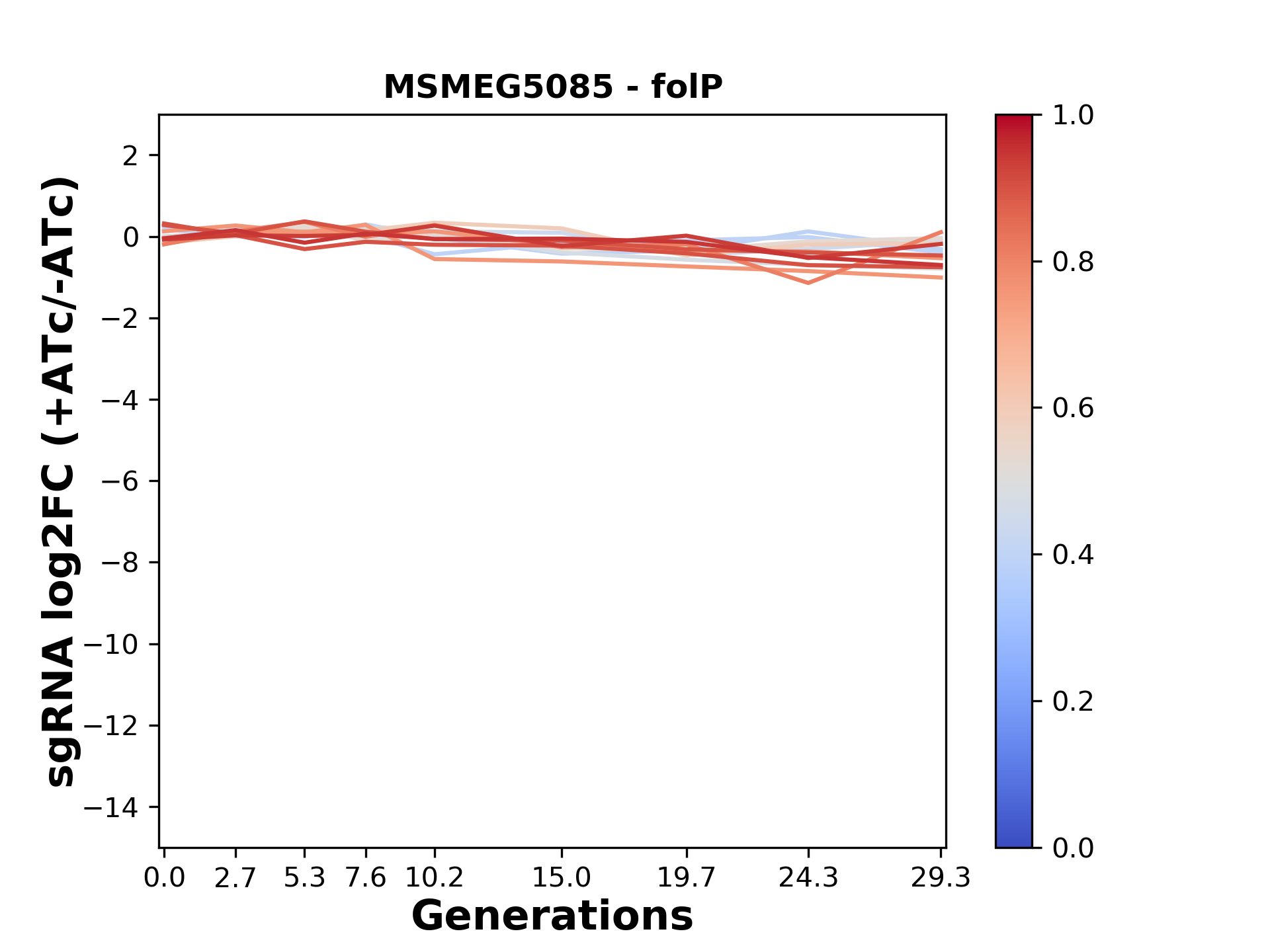 Here, we show sgRNA log2 fold-change values (L2FC) (plus versus minus ATc) over consecutive generations for sgRNAs targeting the gene you selected.