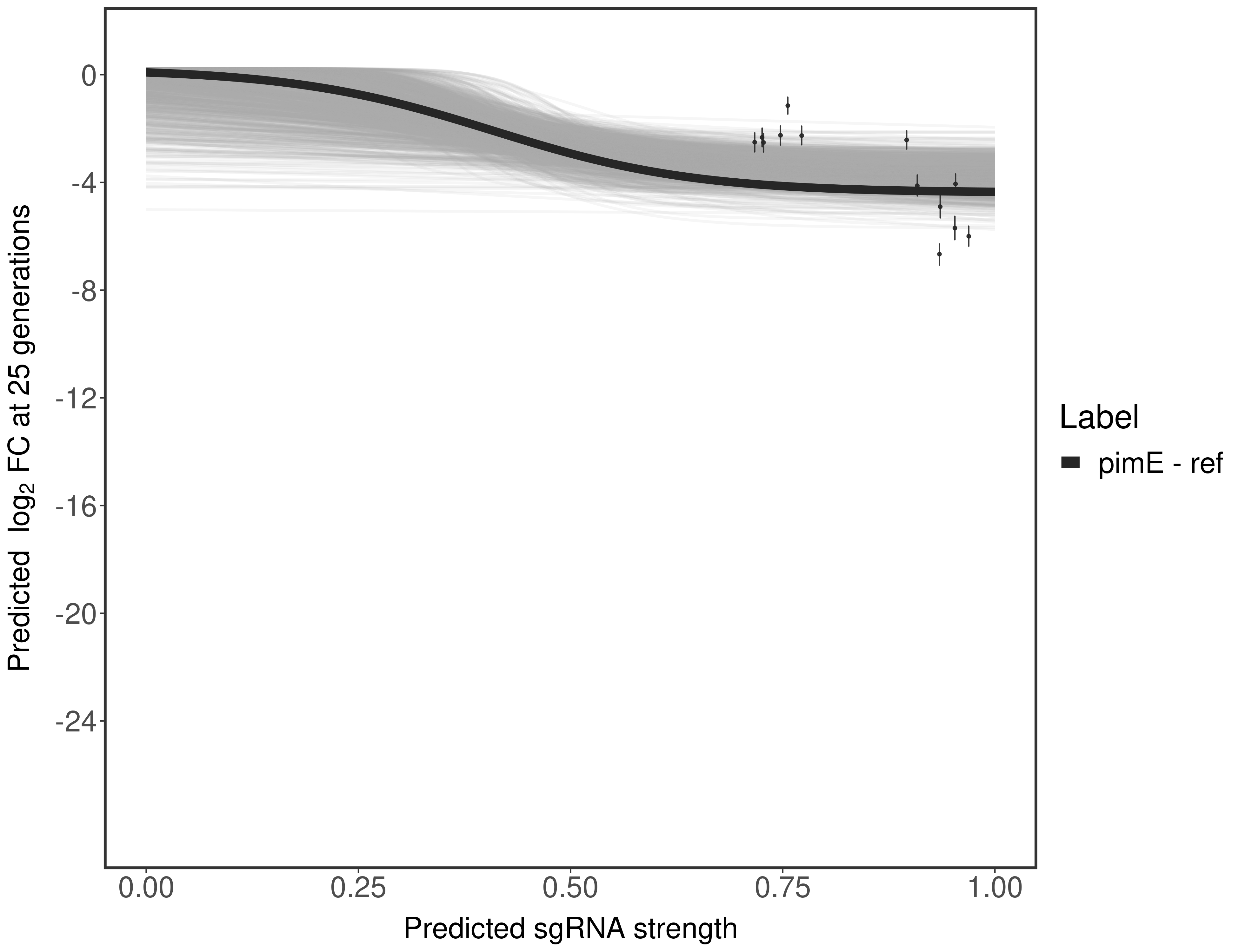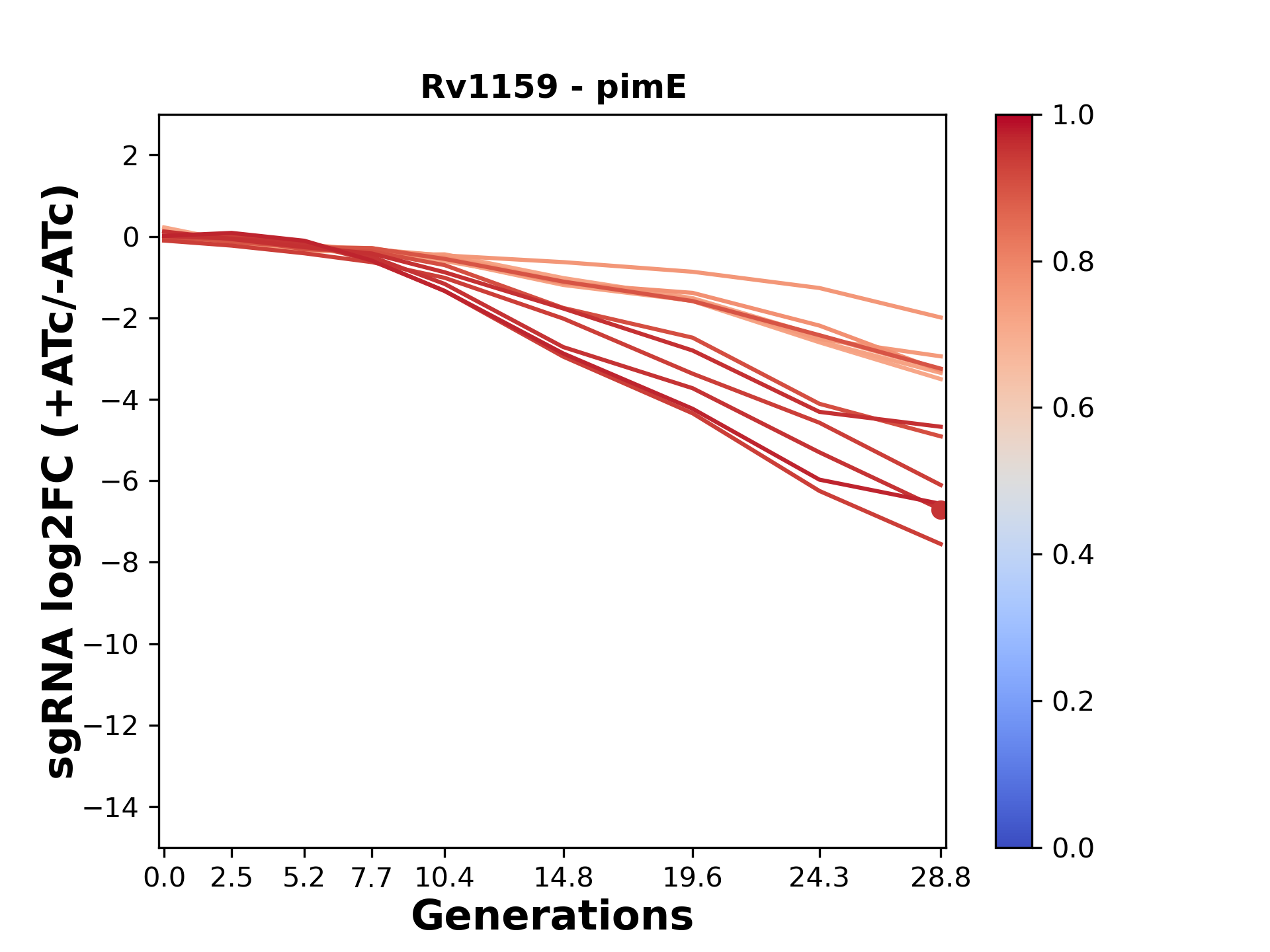 Here, we show sgRNA log2 fold-change values (L2FC) (plus versus minus ATc) over consecutive generations for sgRNAs targeting the gene you selected.
