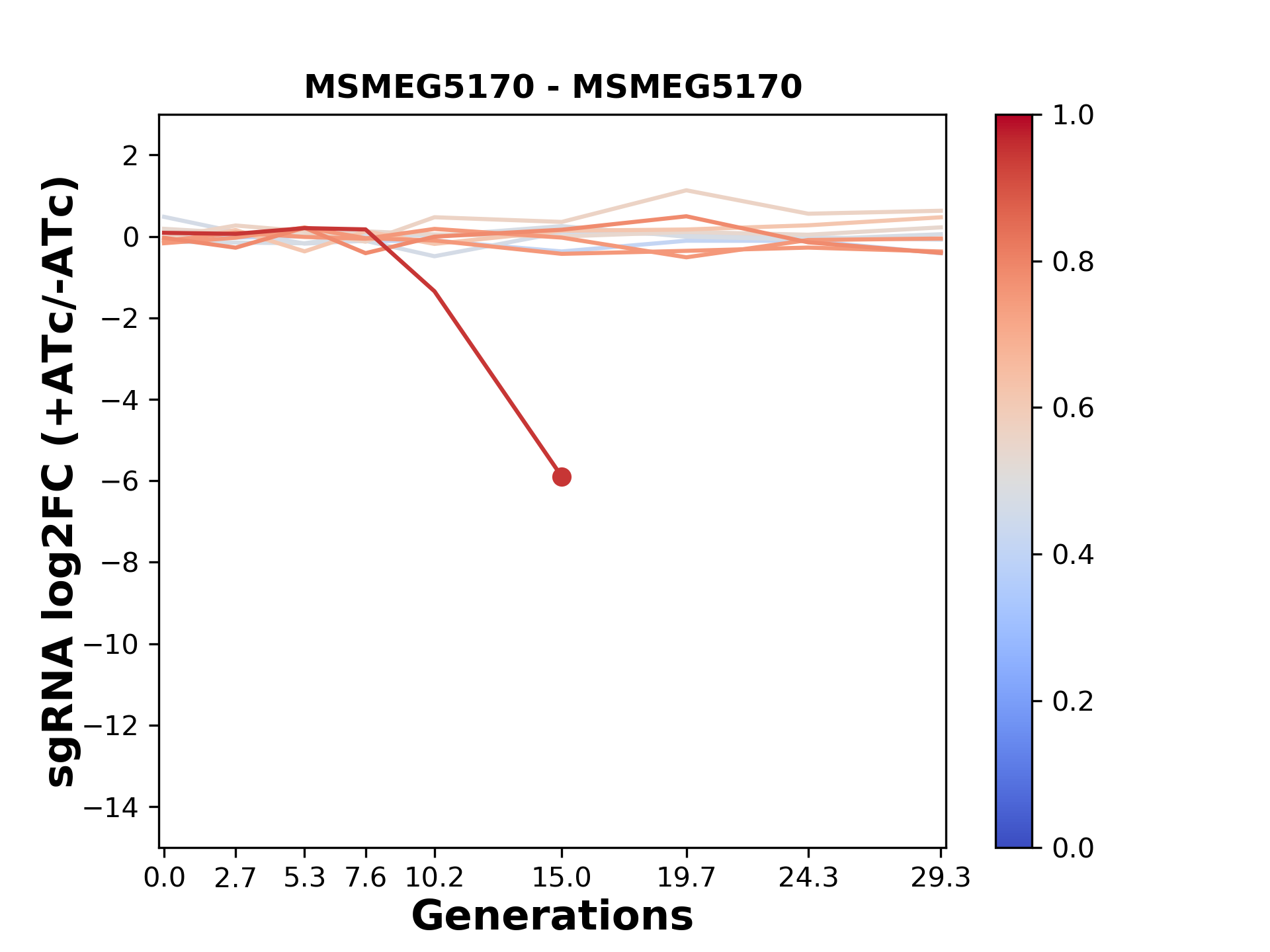 Here, we show sgRNA log2 fold-change values (L2FC) (plus versus minus ATc) over consecutive generations for sgRNAs targeting the gene you selected.