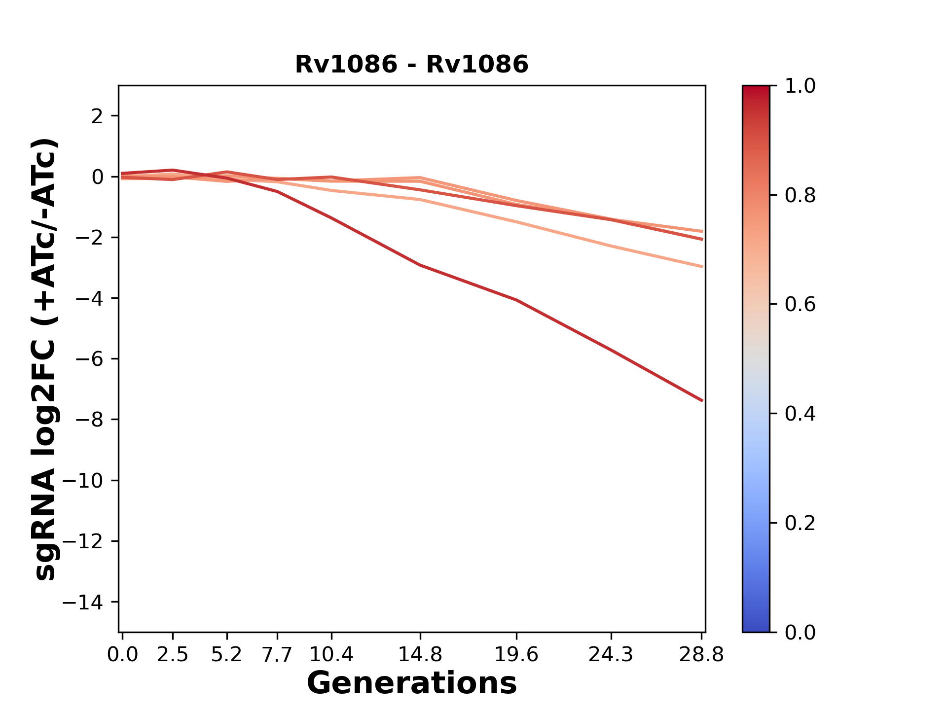 Here, we show sgRNA log2 fold-change values (L2FC) (plus versus minus ATc) over consecutive generations for sgRNAs targeting the gene you selected.