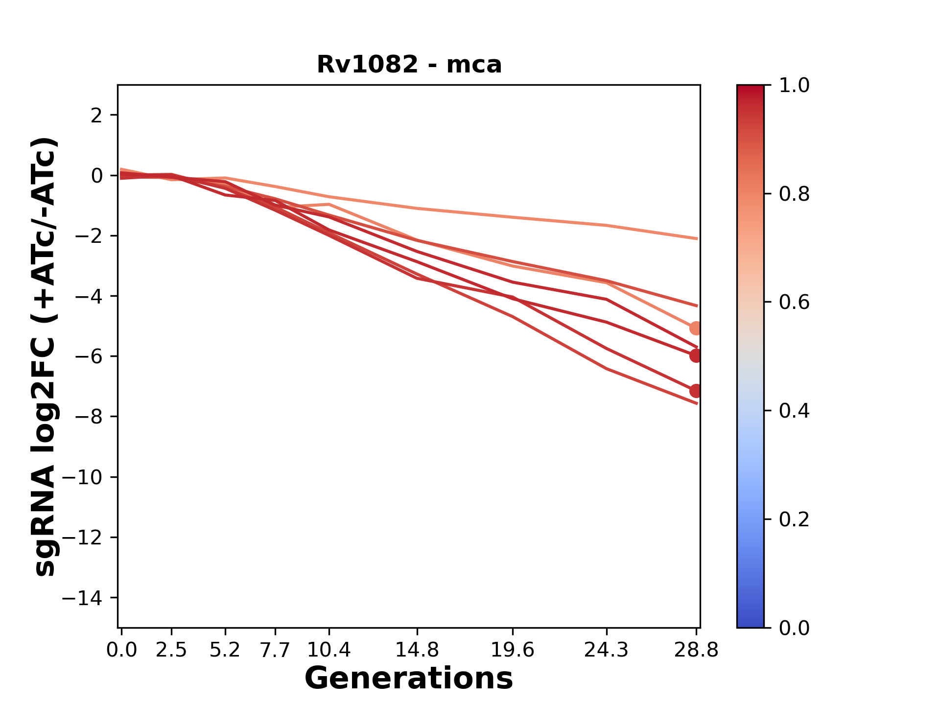Here, we show sgRNA log2 fold-change values (L2FC) (plus versus minus ATc) over consecutive generations for sgRNAs targeting the gene you selected.