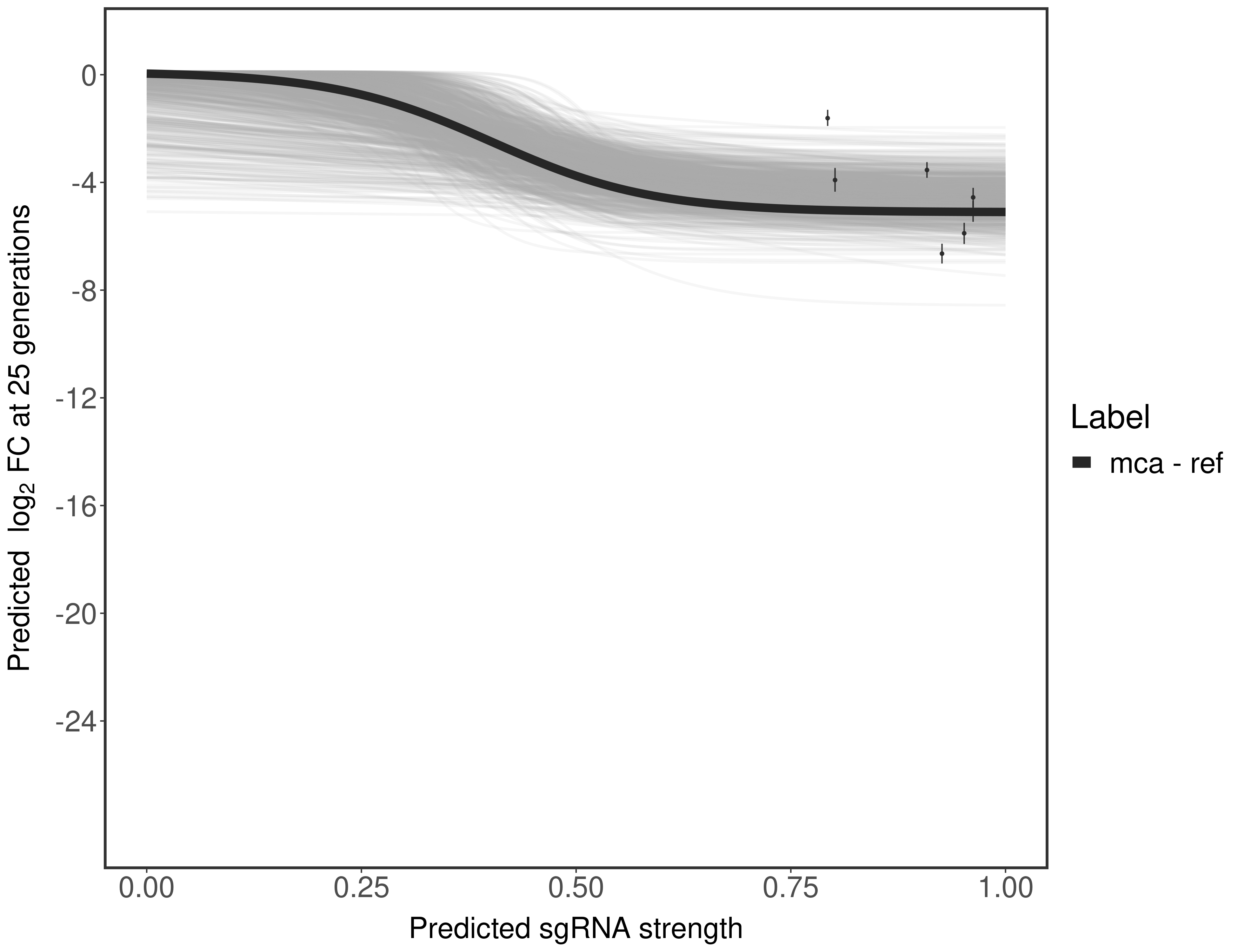 In order to quantify gene vulnerability, data were subsequently analyzed with a hierarchical model at the sgRNA level (two-line model) and gene level (Hill curve). The vulnerability quantification is shown below. [More information]