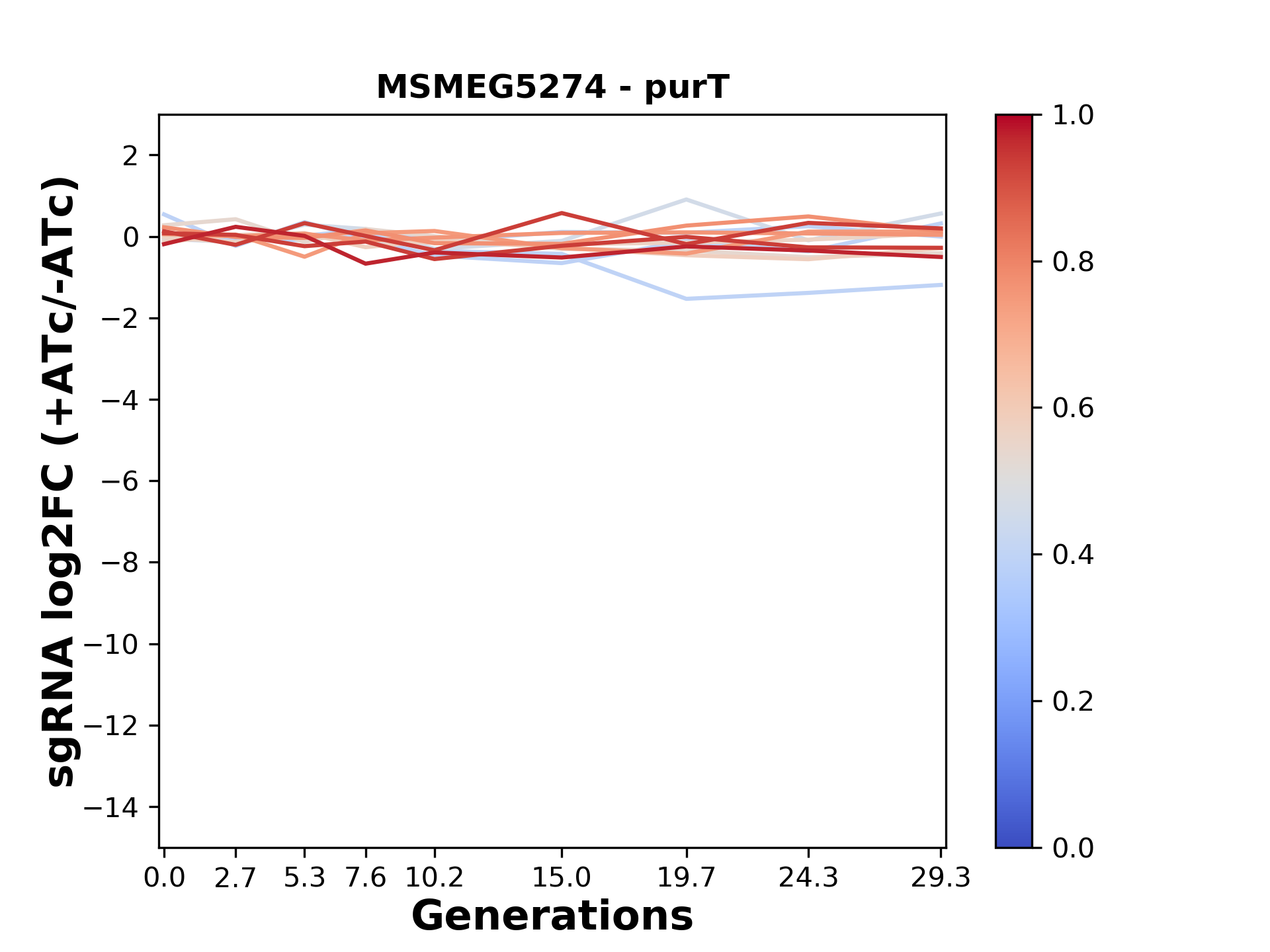 Here, we show sgRNA log2 fold-change values (L2FC) (plus versus minus ATc) over consecutive generations for sgRNAs targeting the gene you selected.