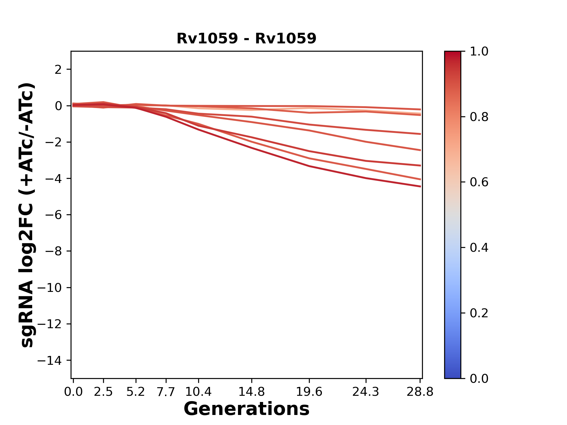 Here, we show sgRNA log2 fold-change values (L2FC) (plus versus minus ATc) over consecutive generations for sgRNAs targeting the gene you selected.
