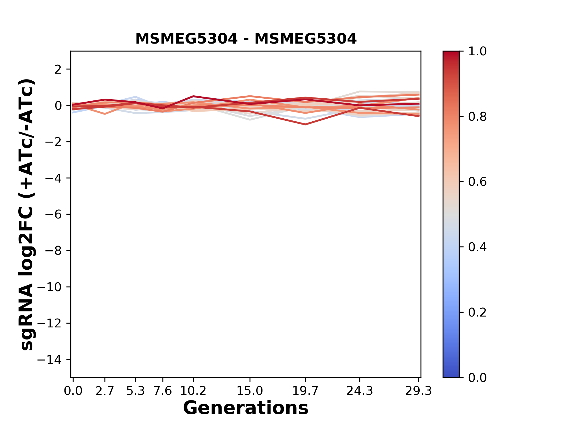 Here, we show sgRNA log2 fold-change values (L2FC) (plus versus minus ATc) over consecutive generations for sgRNAs targeting the gene you selected.