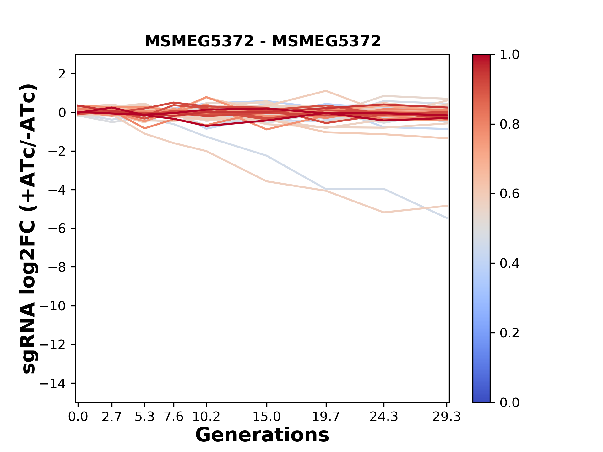 Here, we show sgRNA log2 fold-change values (L2FC) (plus versus minus ATc) over consecutive generations for sgRNAs targeting the gene you selected.