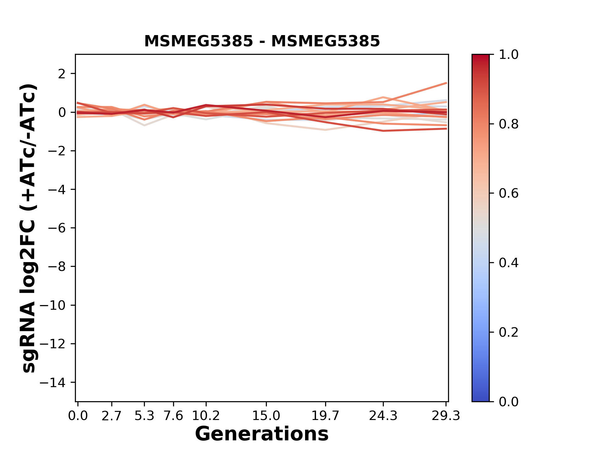Here, we show sgRNA log2 fold-change values (L2FC) (plus versus minus ATc) over consecutive generations for sgRNAs targeting the gene you selected.