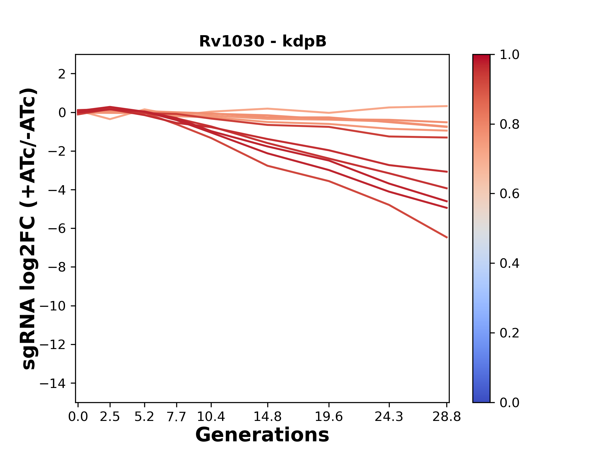 Here, we show sgRNA log2 fold-change values (L2FC) (plus versus minus ATc) over consecutive generations for sgRNAs targeting the gene you selected.