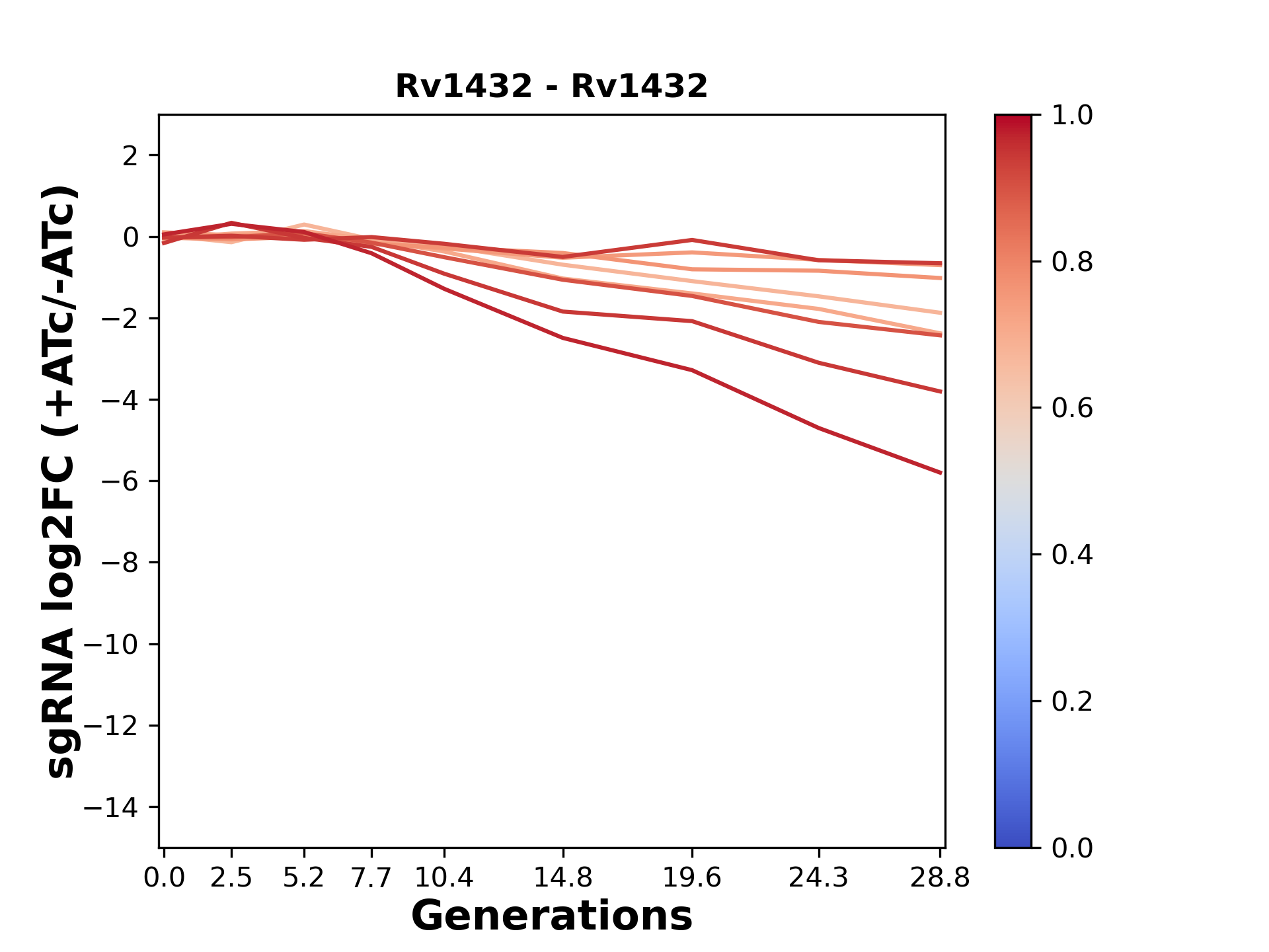 Here, we show sgRNA log2 fold-change values (L2FC) (plus versus minus ATc) over consecutive generations for sgRNAs targeting the gene you selected.