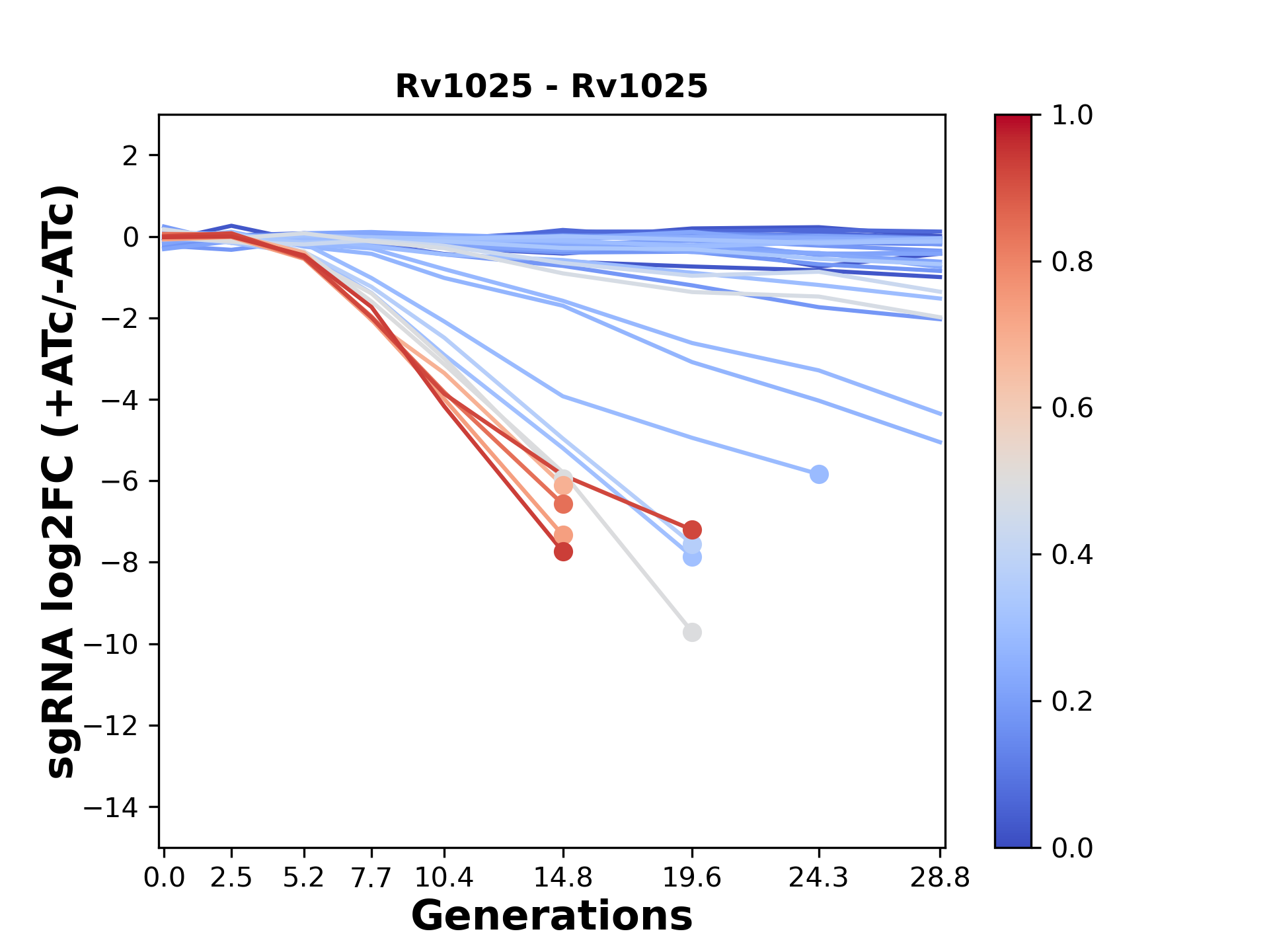 Here, we show sgRNA log2 fold-change values (L2FC) (plus versus minus ATc) over consecutive generations for sgRNAs targeting the gene you selected.