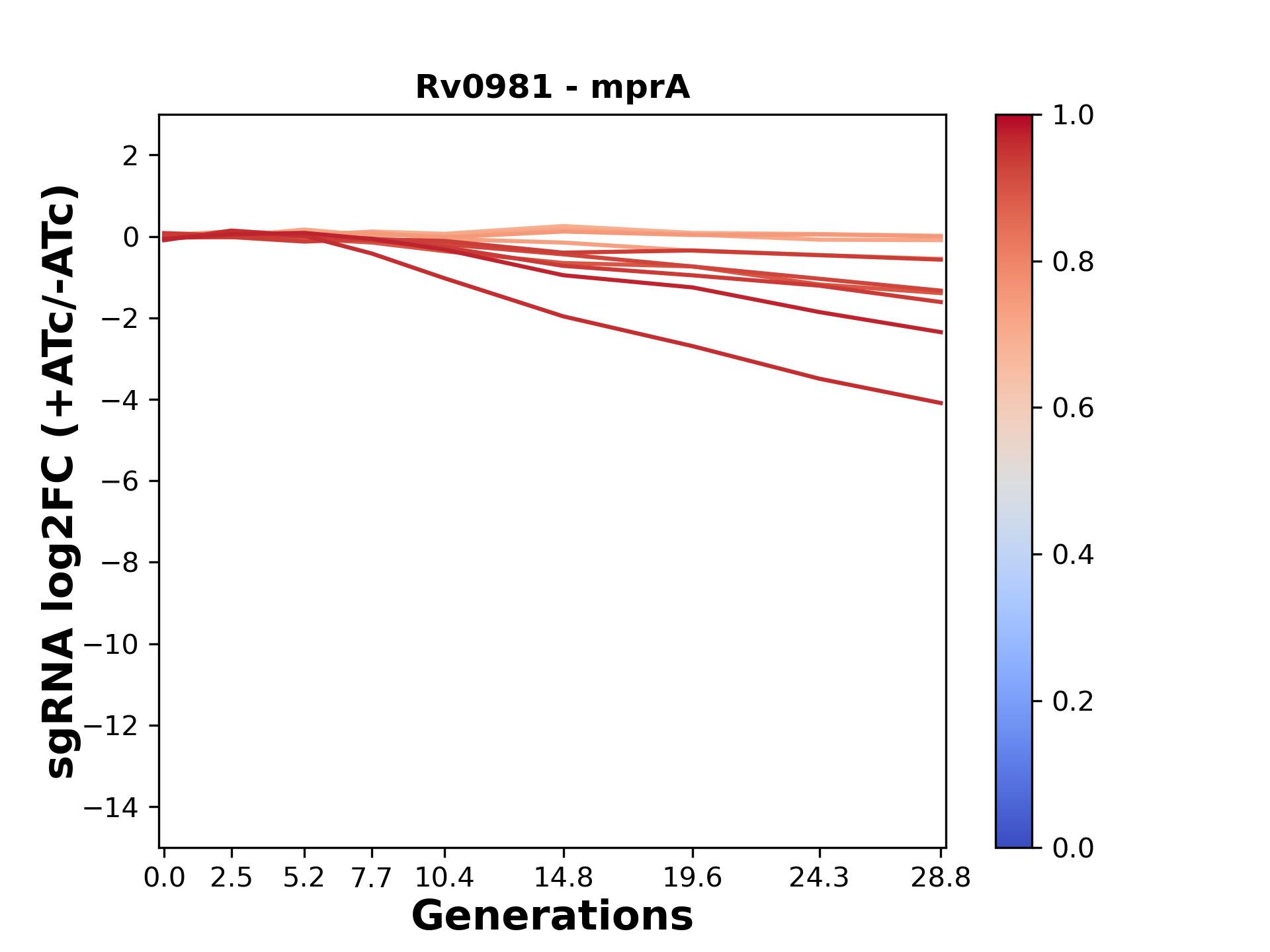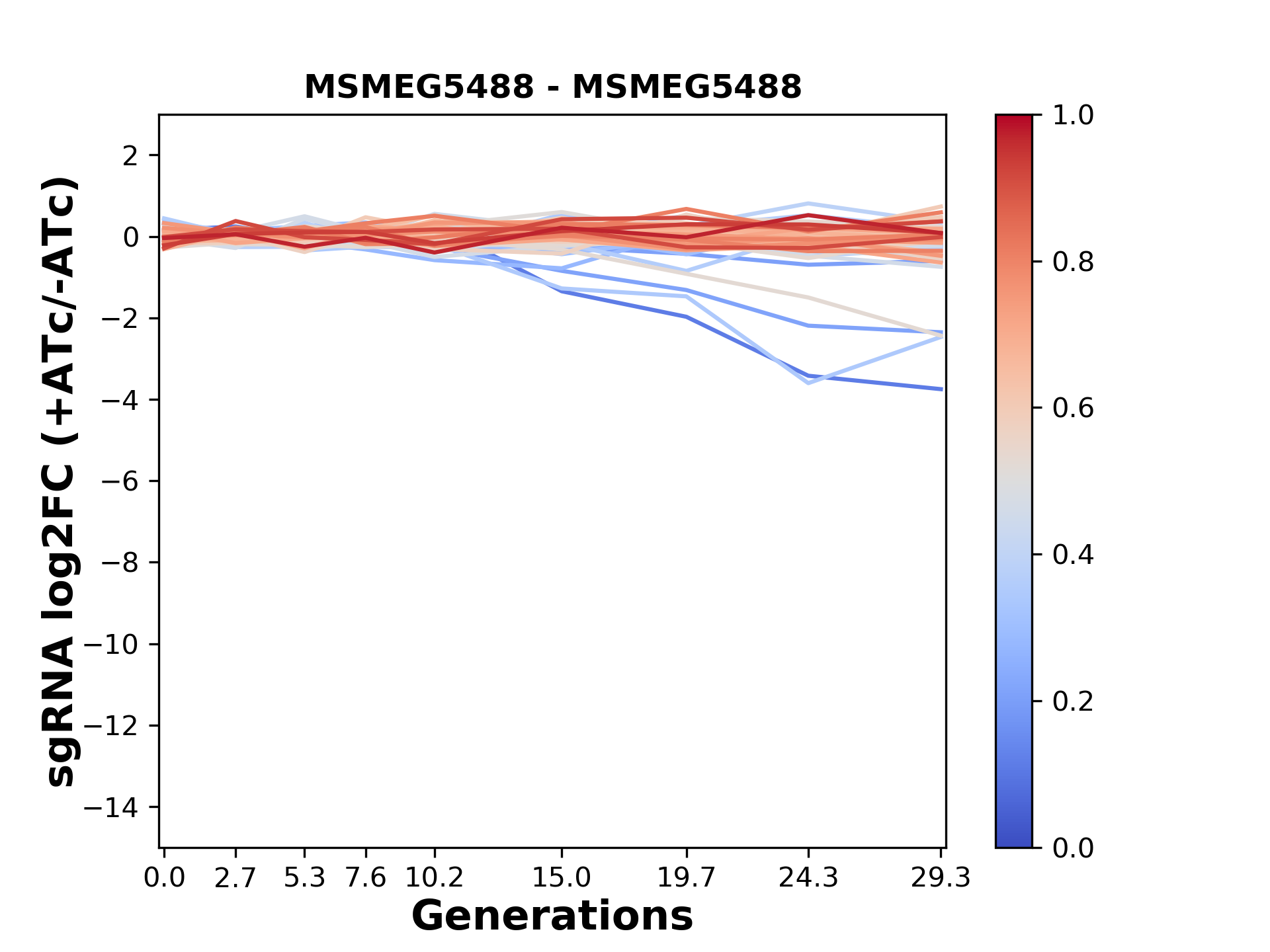 Here, we show sgRNA log2 fold-change values (L2FC) (plus versus minus ATc) over consecutive generations for sgRNAs targeting the gene you selected.