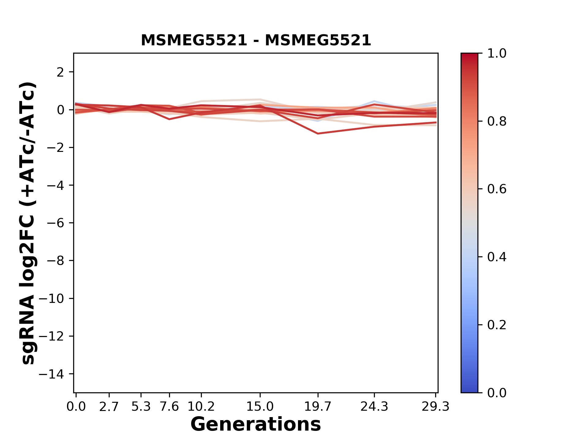 Here, we show sgRNA log2 fold-change values (L2FC) (plus versus minus ATc) over consecutive generations for sgRNAs targeting the gene you selected.