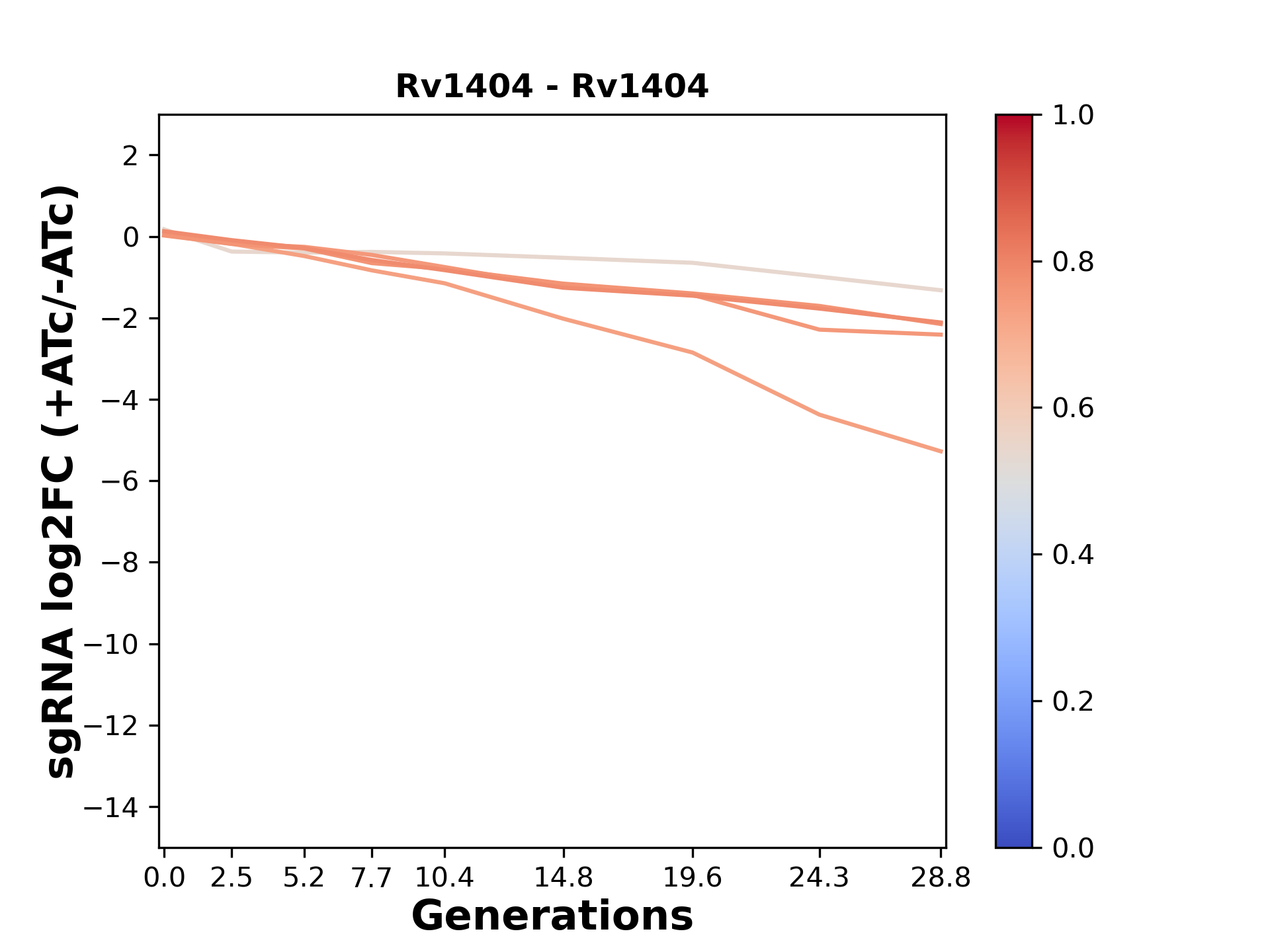 Here, we show sgRNA log2 fold-change values (L2FC) (plus versus minus ATc) over consecutive generations for sgRNAs targeting the gene you selected.