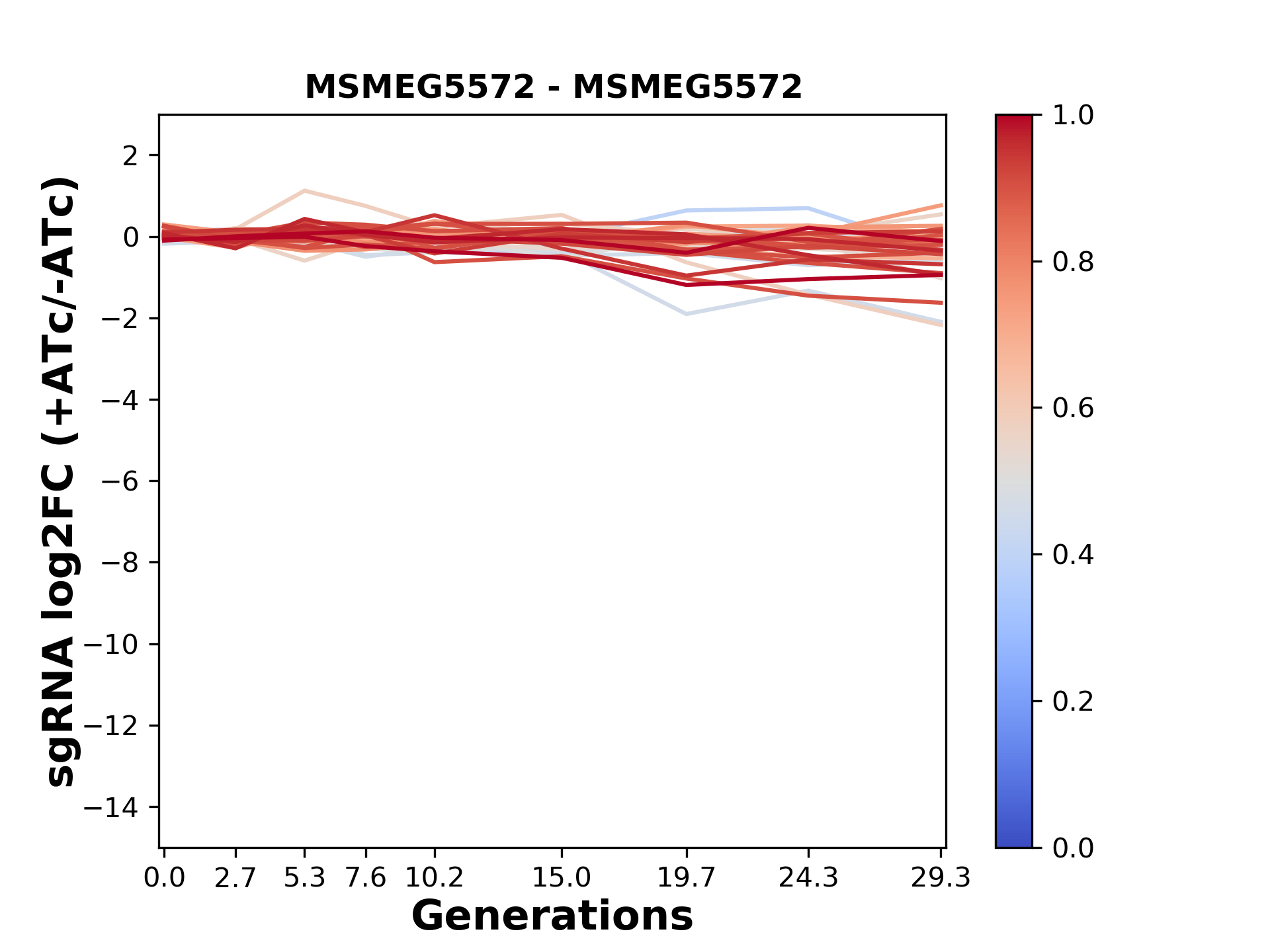 Here, we show sgRNA log2 fold-change values (L2FC) (plus versus minus ATc) over consecutive generations for sgRNAs targeting the gene you selected.