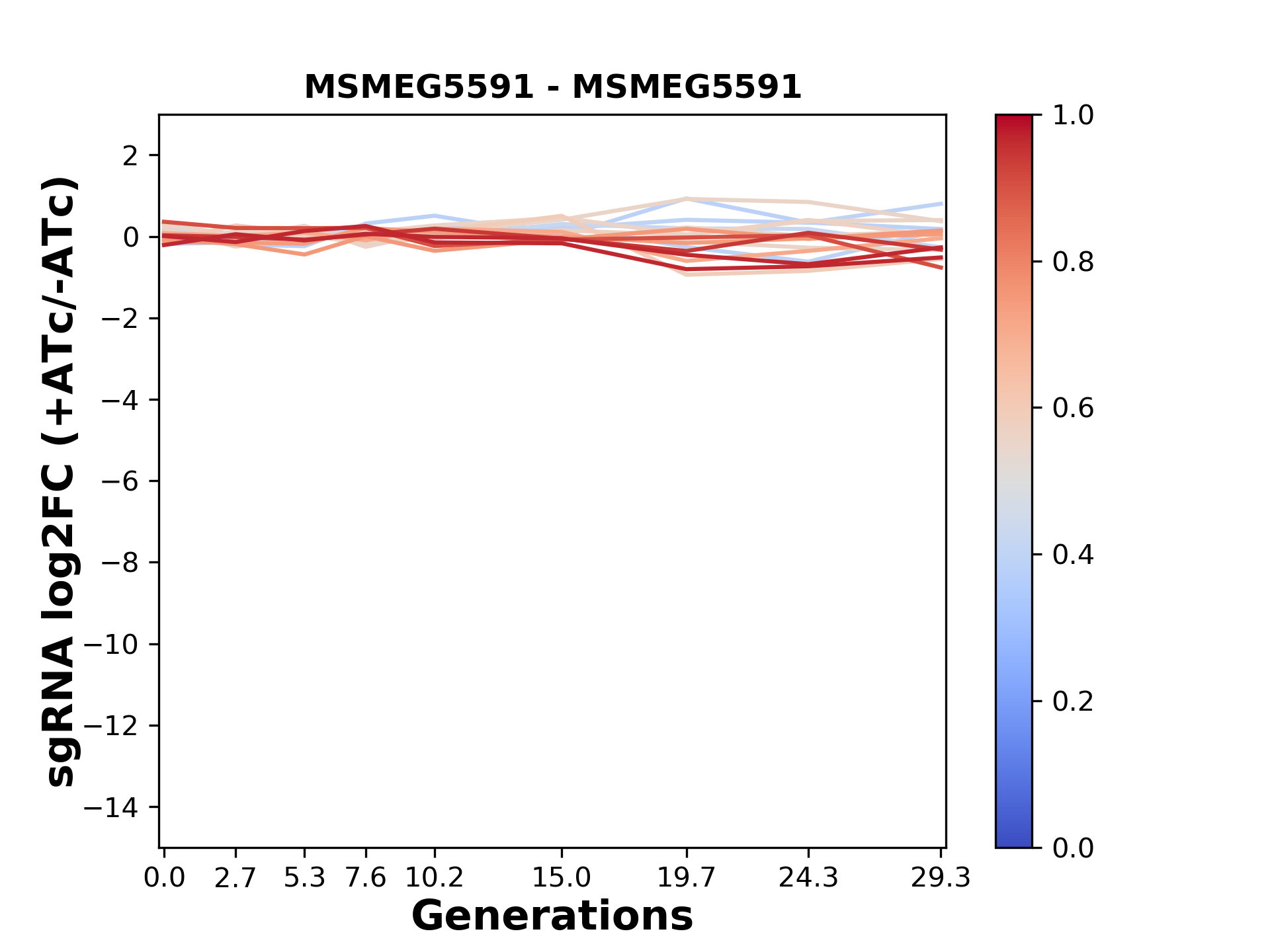Here, we show sgRNA log2 fold-change values (L2FC) (plus versus minus ATc) over consecutive generations for sgRNAs targeting the gene you selected.