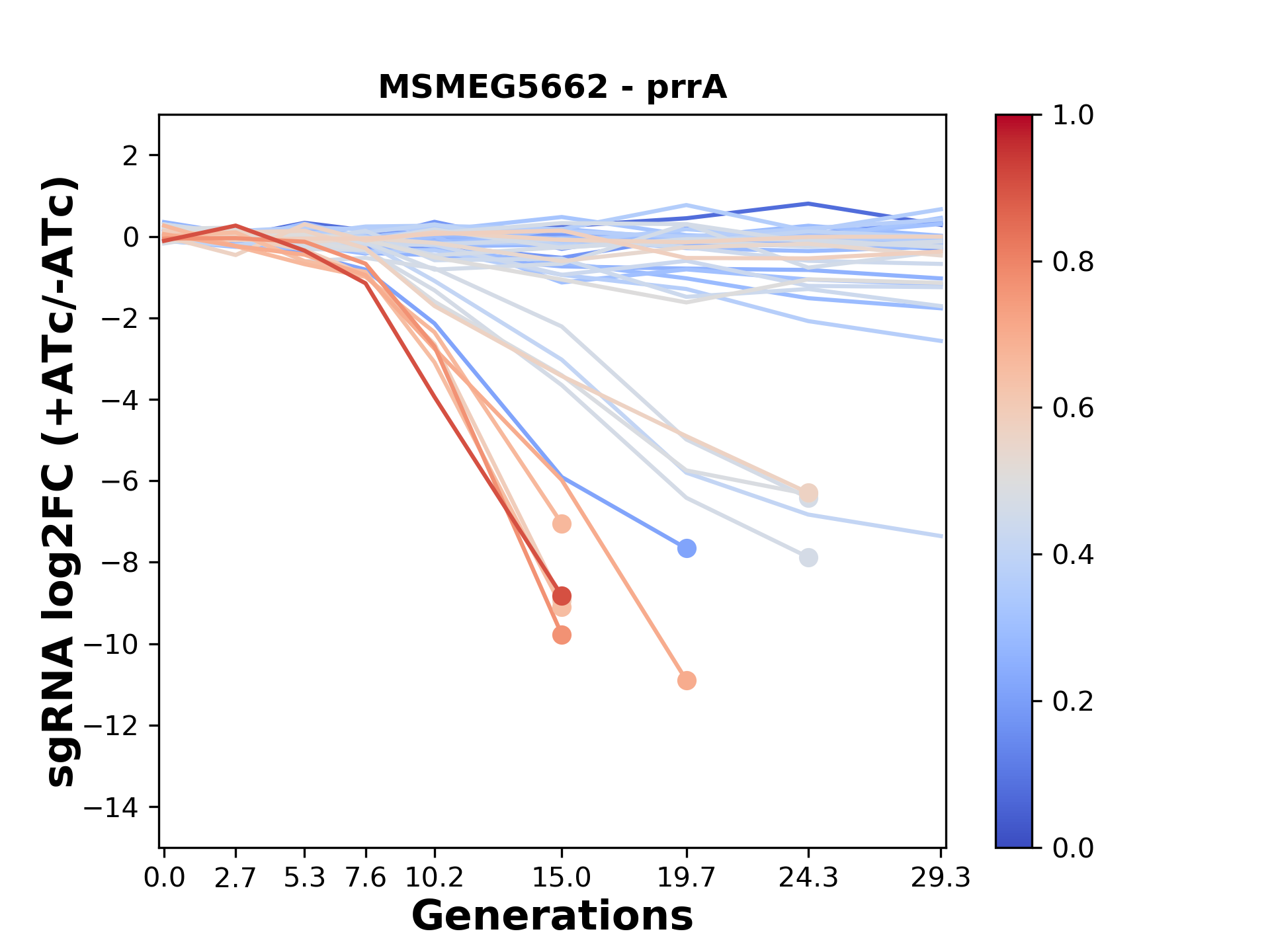 Here, we show sgRNA log2 fold-change values (L2FC) (plus versus minus ATc) over consecutive generations for sgRNAs targeting the gene you selected.